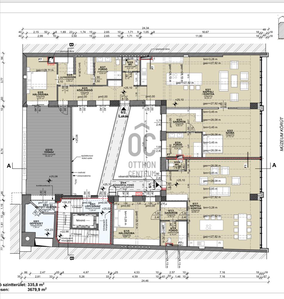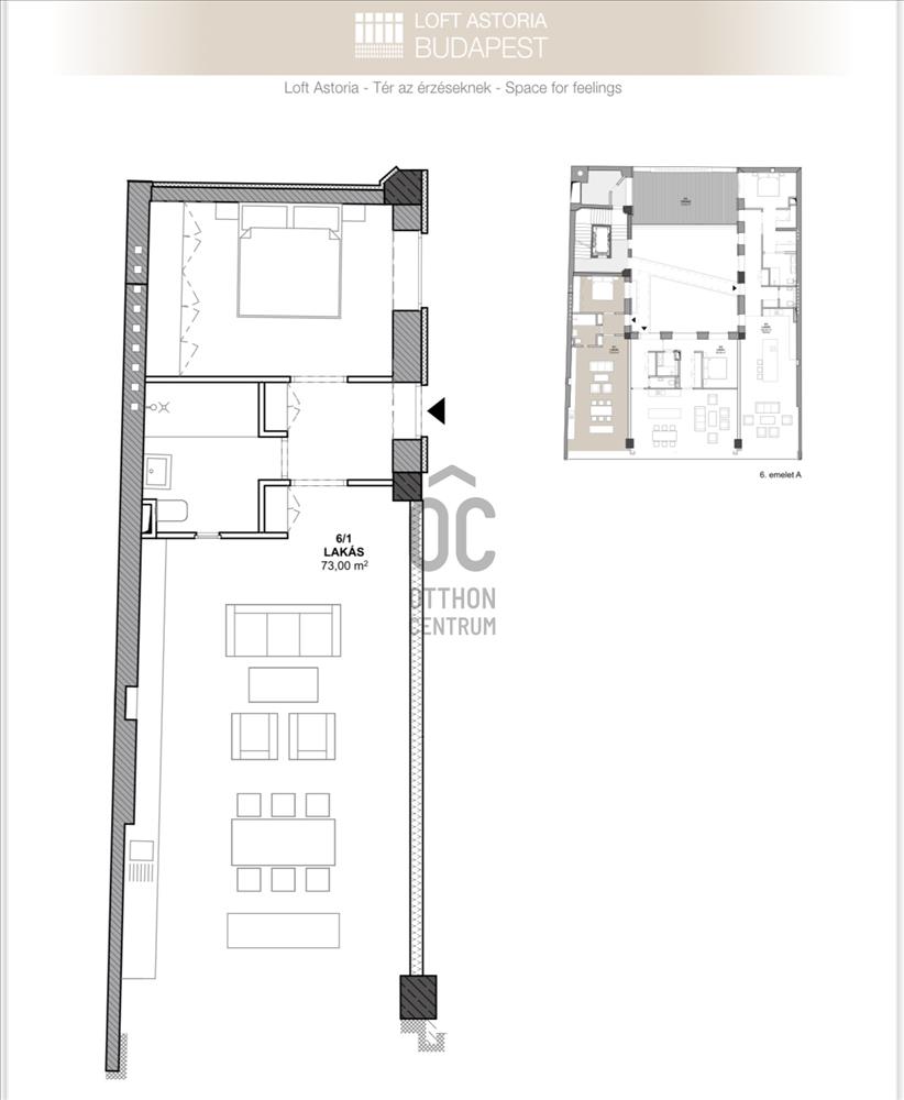 A hatodik emeleten található további két lakás jelenleg még szintén eladó, és a fenti lakással egybenyitható (összesen 275 m2). Így, egy kb. 20 M hosszú egybefüggő üvegfelületen keresztül tekinthetünk a városra a hat emeletnyi magasságból. Ezen az emeleten több lakás nincs.