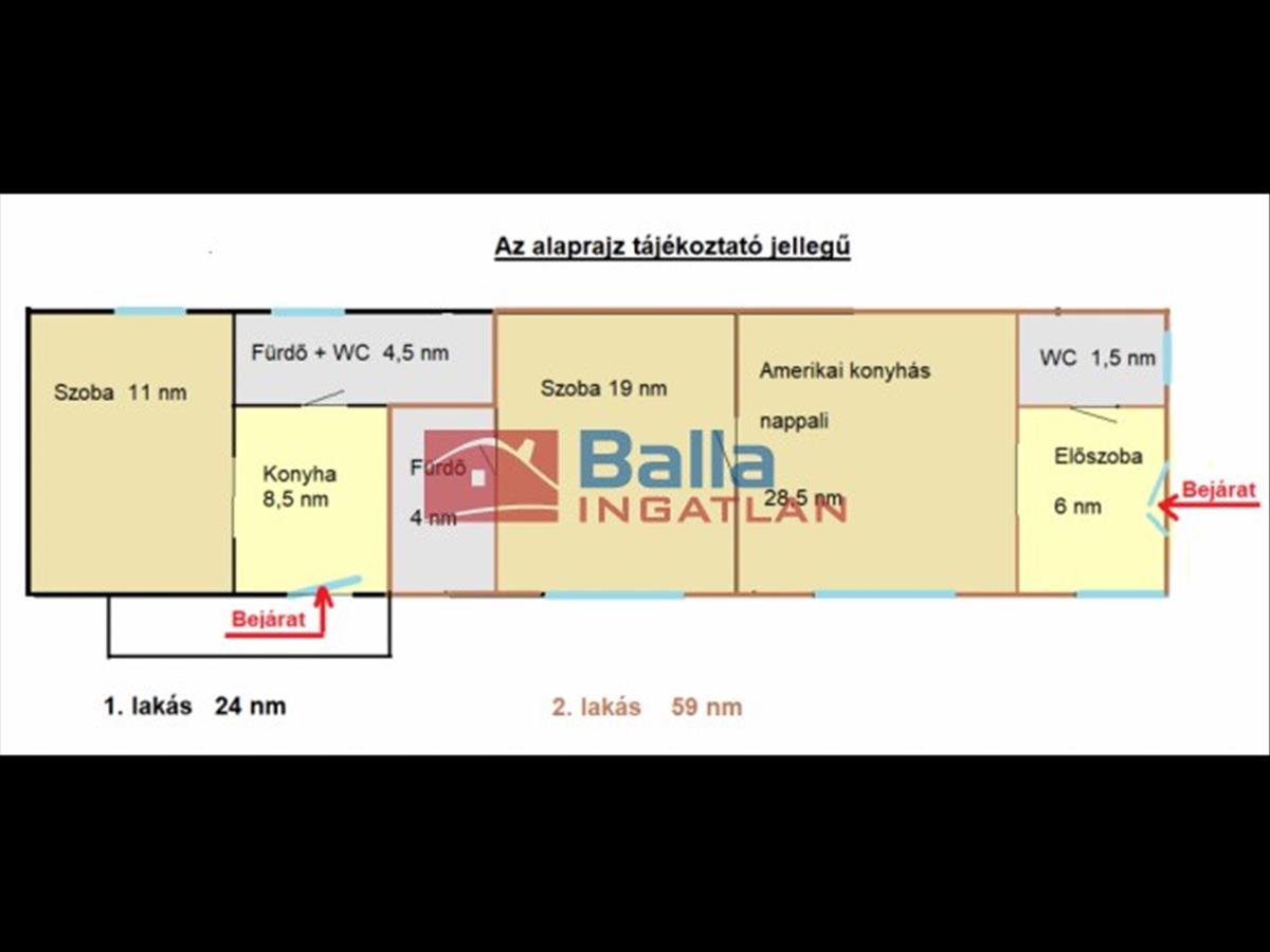 1. Lakás: 59 nm -es, a lépcsőházból közelíthető meg. Az előszobából nyílik a Wc kézmosóval, és a 34 nm -es, kőlappal burkolt amerikai konyhás nappali, innen a belső szobába, és a fürdőbe jutunk.