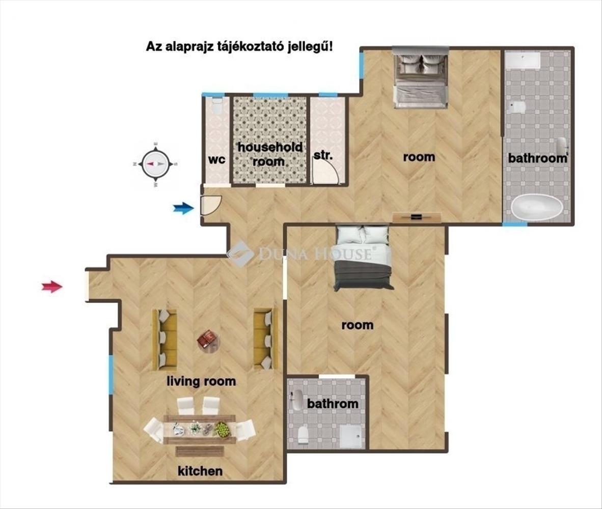 Az elrendezés kényelmes és jól átgondolt: amerikai konyhás nappali, 2 külön nyíló hálószoba és 2 fürdőszoba áll rendelkezésre. a lakás magas színvonalon felújított, esztétikailag és műszakilag is kifogástalan állapotú.