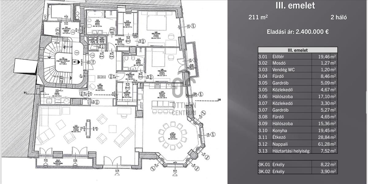 Penthouse különlegessége: Az épület két legfelső szintjét foglalja el, 3 hálószobás elrendezéssel, óriási üvegfelületekkel és két hatalmas, panorámás terasszal.