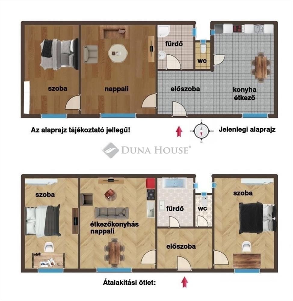 Jelenleg két szobás, de átalakítás után, amerikai konyha-nappali és két külön nyíló hálószobás ingatlanná alakítható.