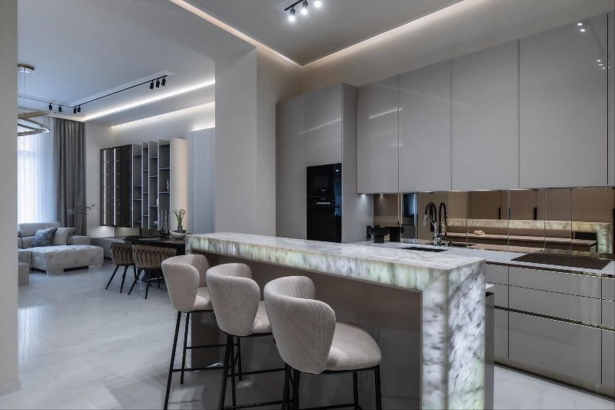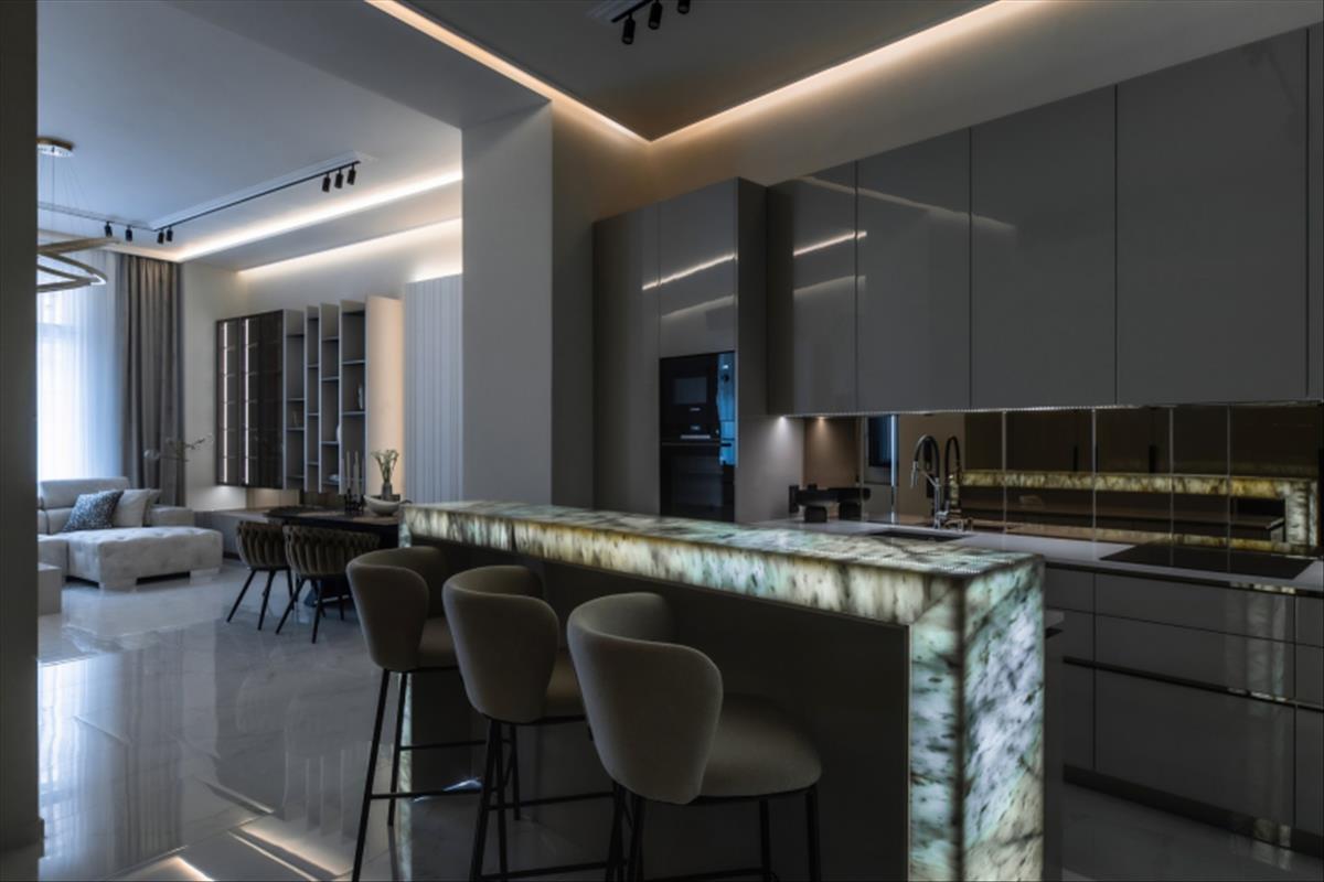 A konyhában található fehér Onyx bárpult változtatható világításával rendkívül hangulatossá varázsolja az egész teret.