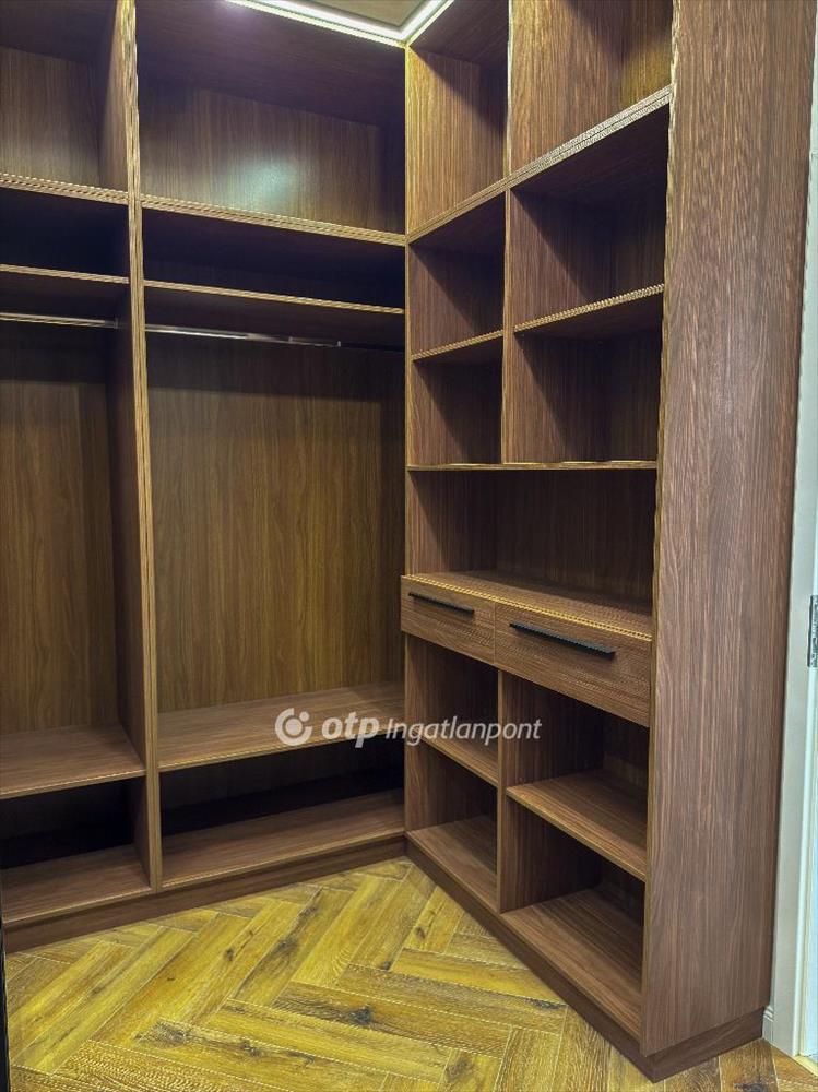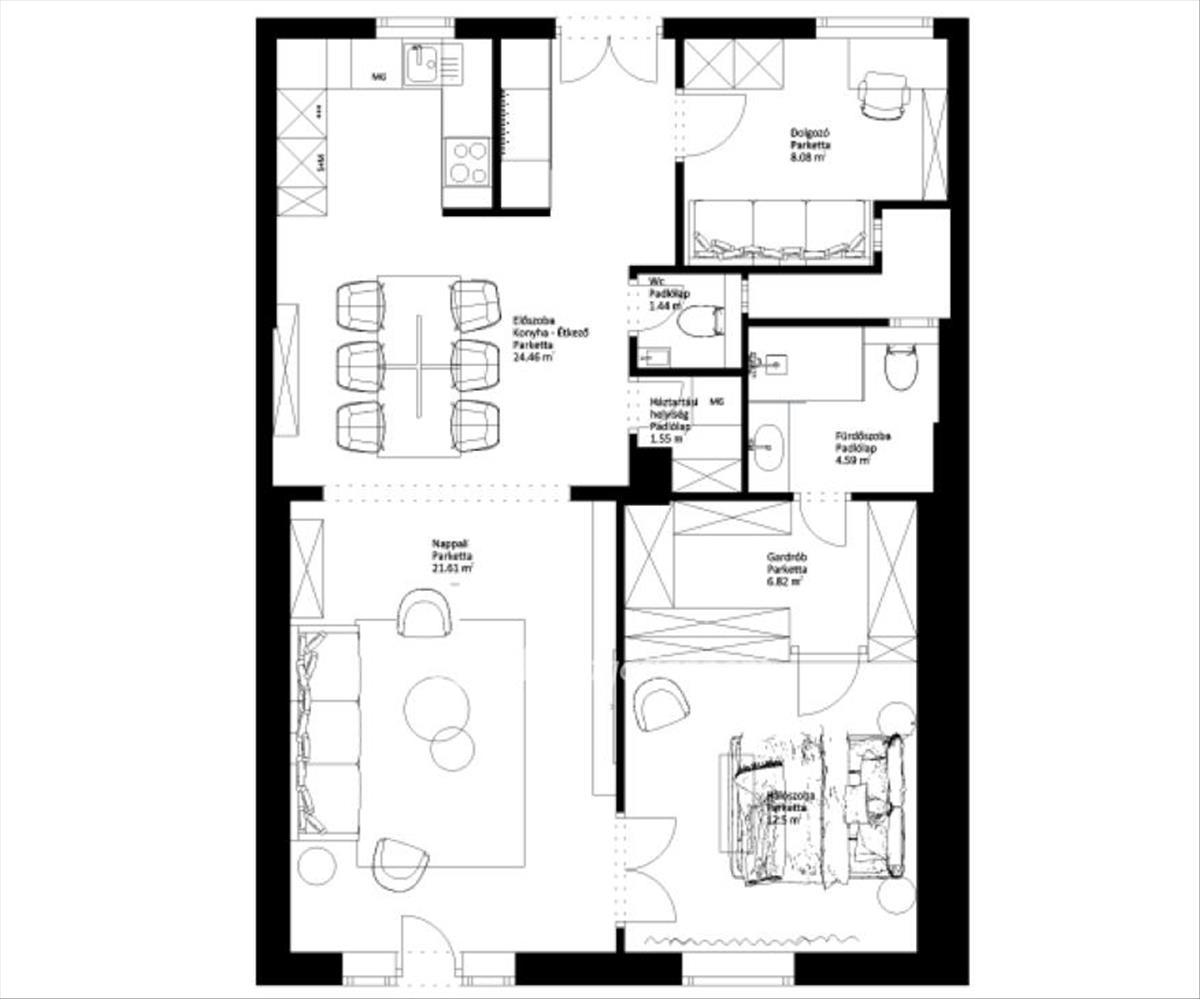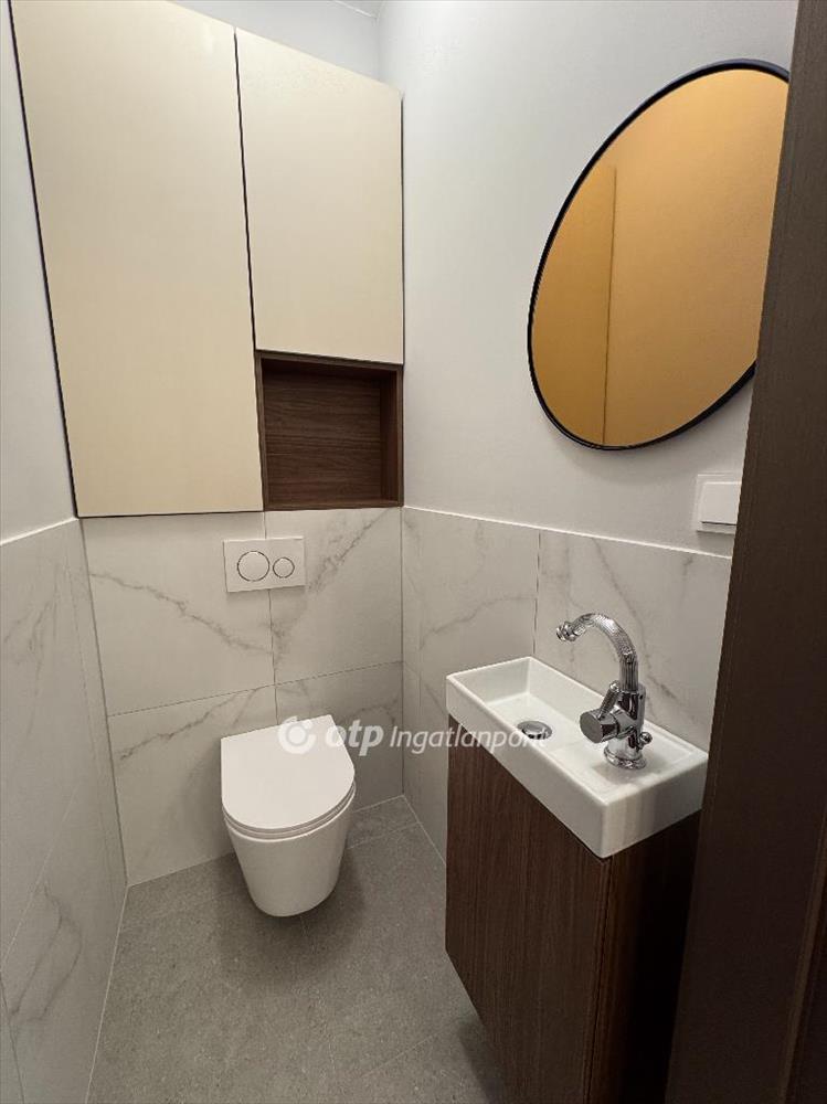 Az előszobából nyílik egy kisebb dolgozó- vagy vendégszoba, majd az egyedi, sötétkék színű, teljesen gépesített konyhába jutunk, amely a nappalival egy légtérben található. Az étkező természetesen elválasztja a konyhát a tágas, napfényben úszó nappalitól. Az előszoba része egy háztartási/gépészeti helyiség, valamint egy különálló wc is. a nappaliból igényes tolóajtón keresztül érhető el a nagy méretű hálószoba, amelyhez saját gardrób és kádas fürdőszoba tartozik.