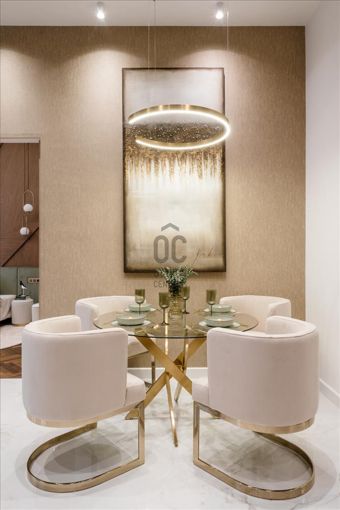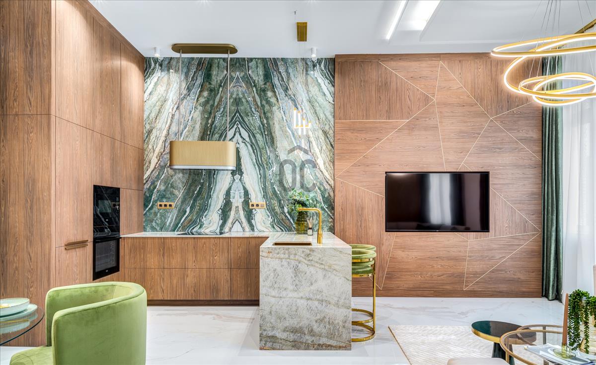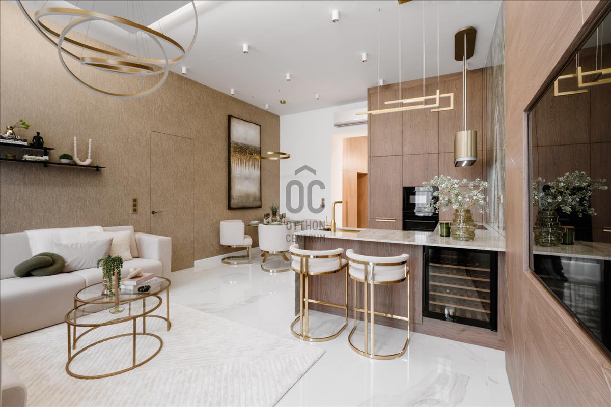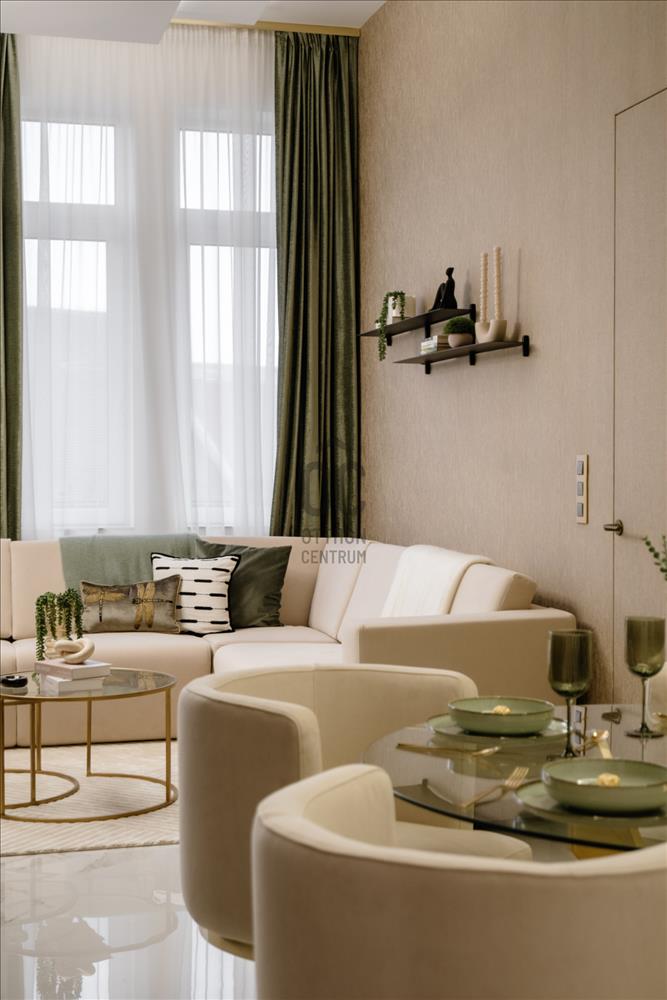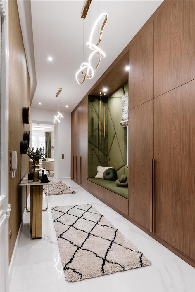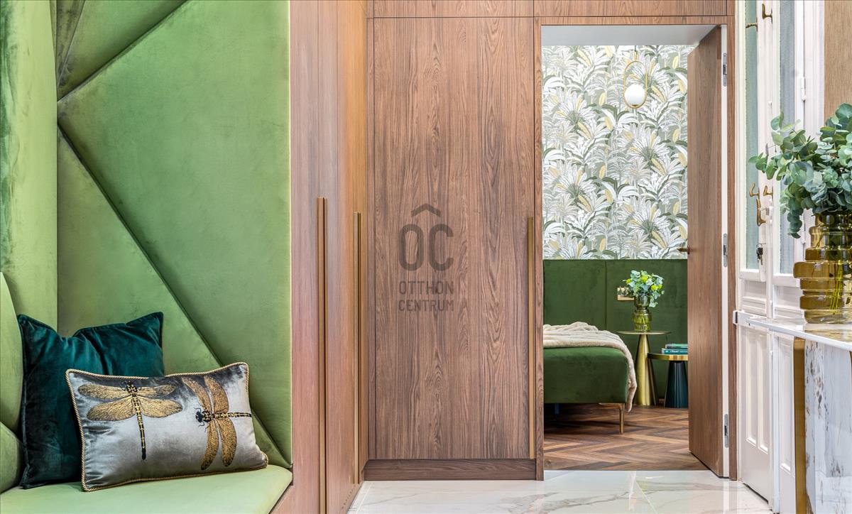 A belső teret a kifinomult dizájn és a részletek iránti tisztelet jellemzi. a parketta meleg árnyalatai és a különleges textúrák az elegancia és a nyugalom érzését keltik, a zöld és barna tónusok eközben otthonos hangulatot teremtenek. Az arany kiegészítők, ékszerekként fénylő lámpatestek, a tükrök és más apró részletek kiemelik a tér luxusát, anélkül, hogy túlzásokba esnének.