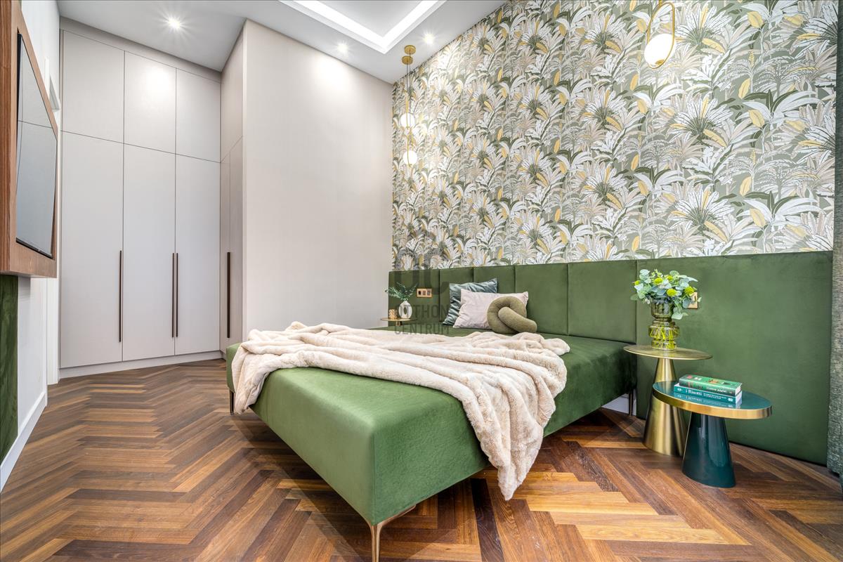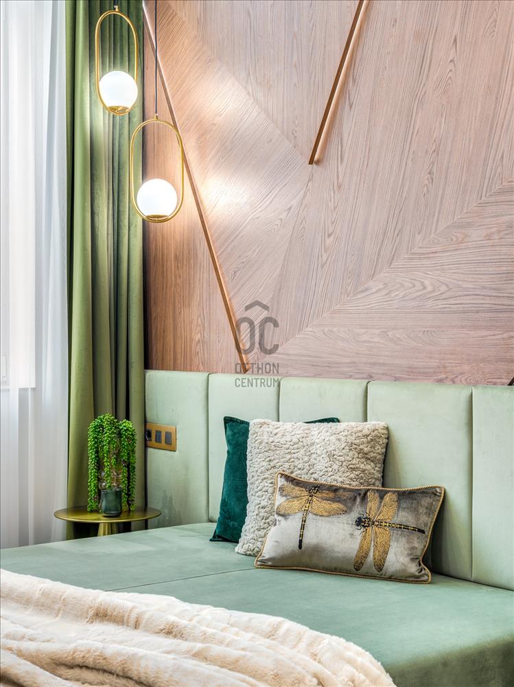 Az egész lakásban a zöld árnyalatai dominálnak, amelyek egy időben hoznak frissességet és nyugalmat a térbe, valamint harmonizálnak a ház szellemiségével.