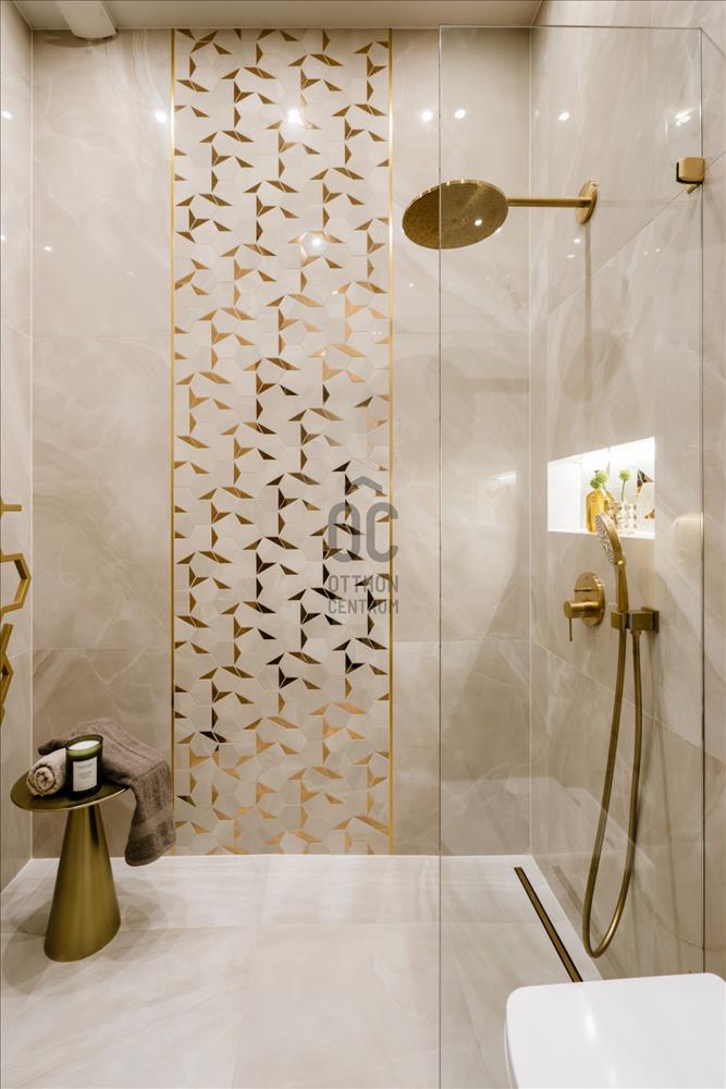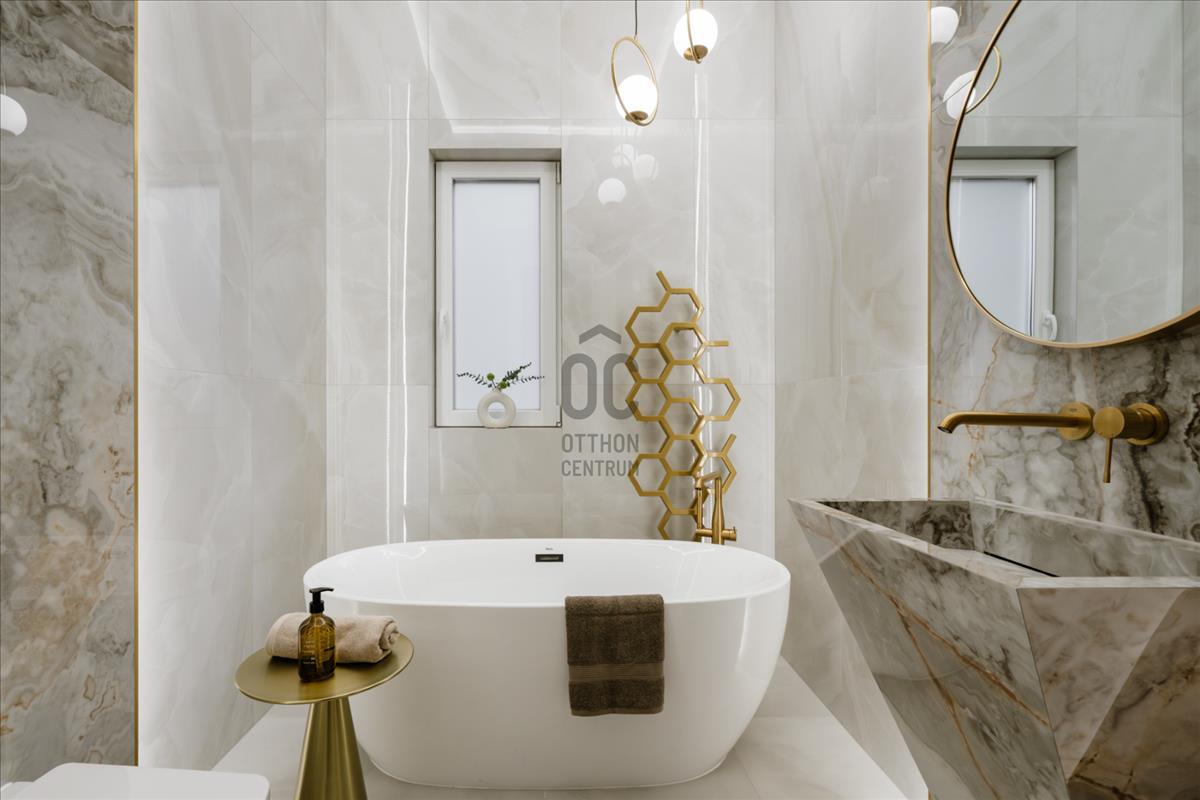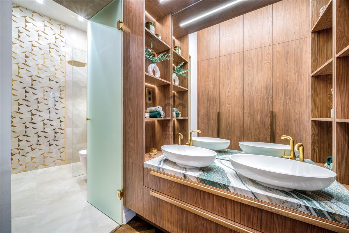 A fürdőszobák a lakás ékességei. Márványhatású burkolatok, a szürke és bézses tónusok eleganciát sugároznak, míg az arany kiegészítők – a csaptelepek, tükrök és egyéb elemek – vonzzák a tekintetet, tökéletes egységet teremtenek a térben. a világítás kiemeli a fürdőszobák finom vonalait és textúráit, még inkább hangsúlyozva a prémium minőségű berendezéseket.