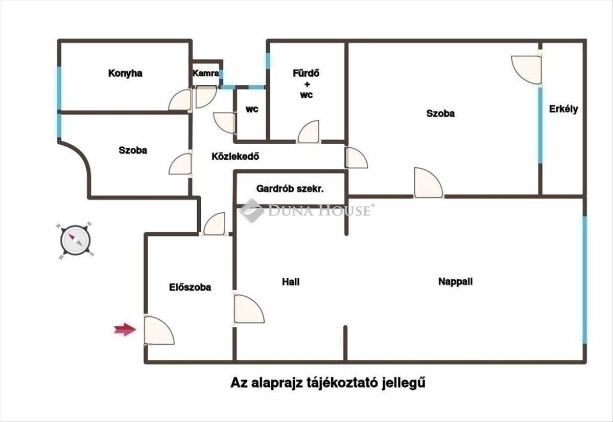 Elosztás: 3 külön nyíló szoba + hall, konyha, fürdő és wc, külön wc, előszoba