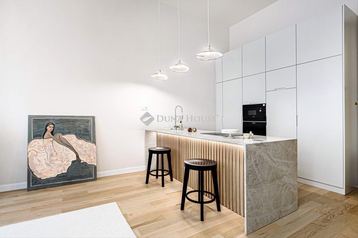 Ennek a történelmi épületnek az első emeletén található ez a 67 m2-es, felújított, hangulatos design lakás. Idén teljes körű felújításon esett át az ingatlan, prémium anyagok felhasználásával. Amerikai konyhás nappali, háló, spájz, fürdőszoba, és két wc található benne. a galérián található egy 9 m2-es tároló, mely könnyedén második hálóvá alakítható igény szerint. Fa parketta. Egyedi bútorok, olasz szaniterek (Cielo), csaptelepek (Zuchetti) lettek beépítve. a konyhában főzőlapba épített elszívó. Korszerű fűtés: padlófűtés hőszivattyúról, plusz fan-coil hűtés-fűtés.