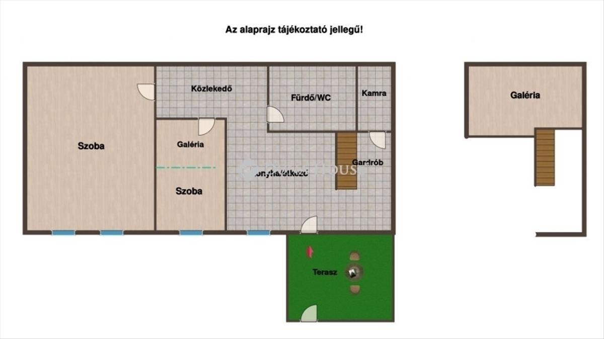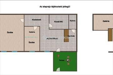 A konyhával szemben galériára vezető lépcső indul, amely a fürdő és a konyha felett helyezkedik el.