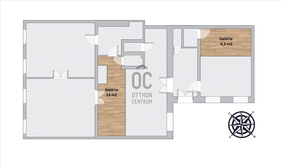 - Két nagyméretű szoba az utcára néz, a nappali és a harmadik szoba a belső udvar felé rendelkezik ablakkal.