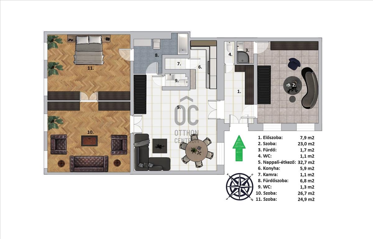 - Felosztása: előszoba, nappali-konyha-étkező, 3 hálószoba, kamra, 2 fürdőszoba, 2 WC.