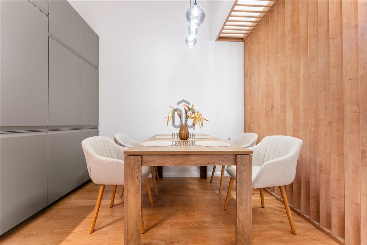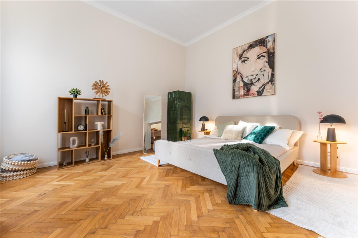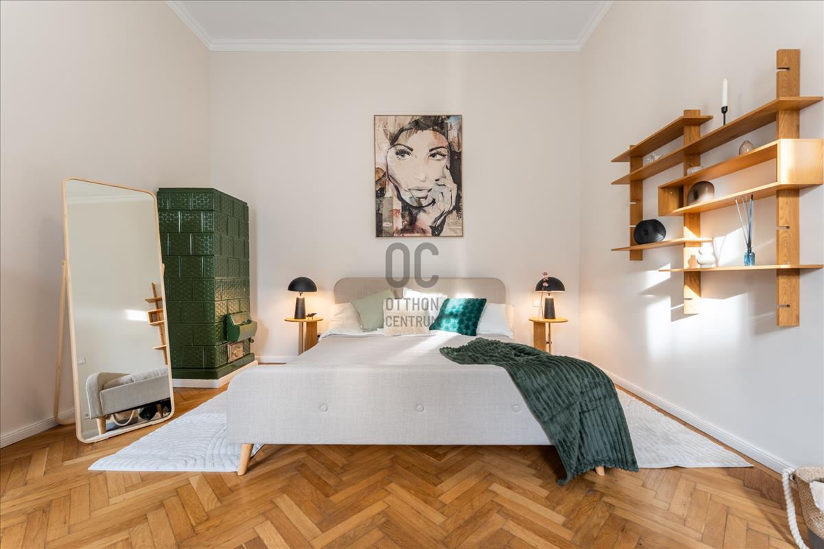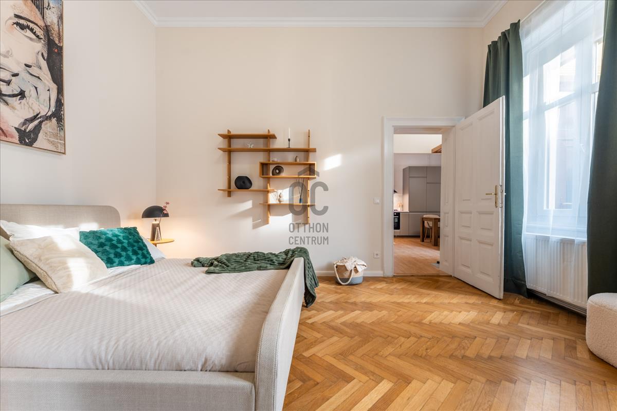 A lakás teljes körű felújításon esett át, minden eleme átgondolt tervezéssel és minőségi anyaghasználattal készült, miközben megőrizte a klasszikus polgári stílus jellegzetességeit: a 3, 7 méteres belmagasságot, a halszálka parkettát és a régi típusú beltéri ajtók eleganciáját.