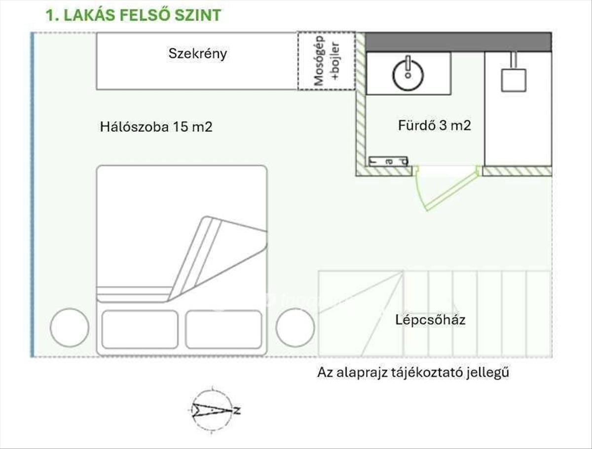A földszinten amerikai konyhás nappali és wc az emeleten hálószoba valamint fürdőszoba található.