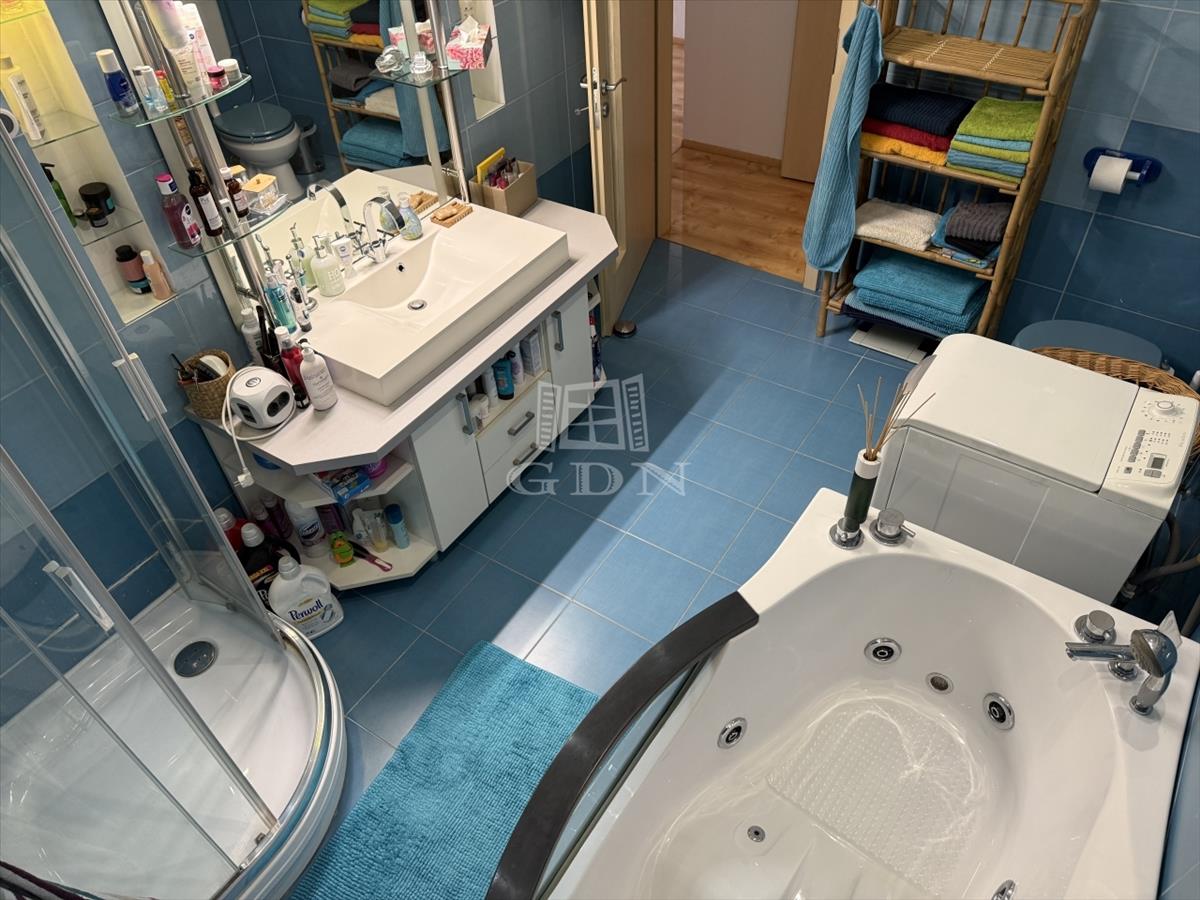 A fürdőszoba igazi luxust kínál, hidromasszázs kád és zuhanykabin is megtalálható benne. a belső tér kiemelkedő belmagassággal rendelkezik, amely a tágasság érzetét növeli.
