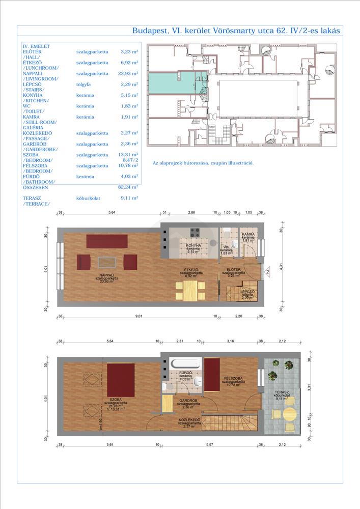 Eladó a VI. kerület közkedvelt Vörösmarty utcájában egy belső kétszintes, nettó 89 m²-es, igényesen felújított lakás, 9 m²-es erkéllyel, egy karbantartott, szép liftes társasház 4. emeletén.