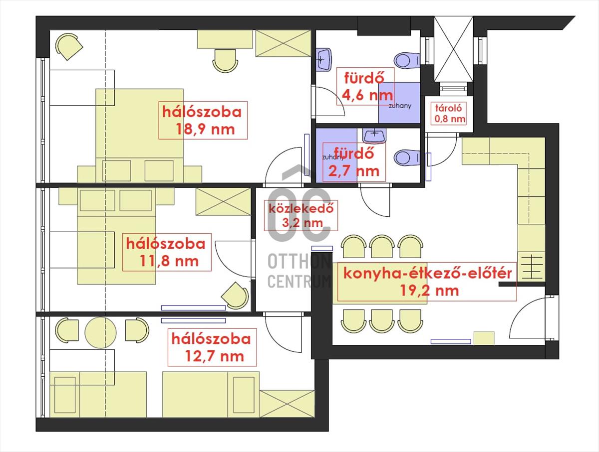 - Étkező-konyha, hálószoba-fürdőszoba, hálószoba, hálószoba, fürdőszoba, tároló, közlekedő