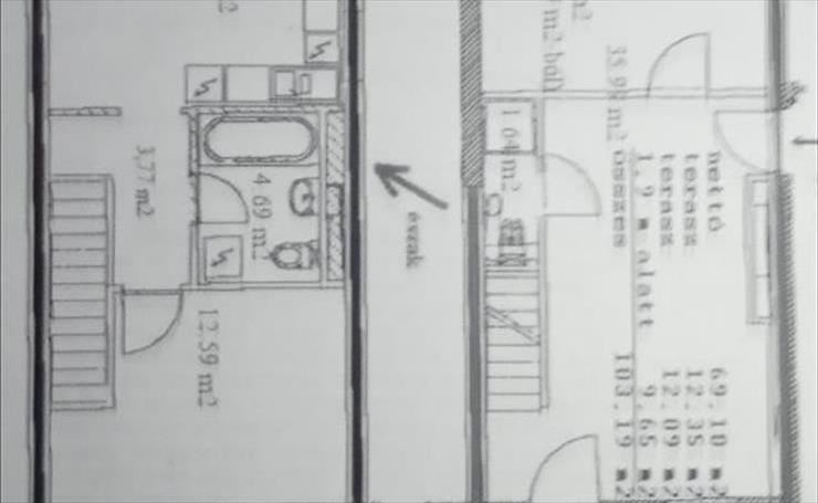 Méret: 69, 1 m2 + 9, 65 m2 (190 cm alatti) + 24, 44 m2 (teraszok)