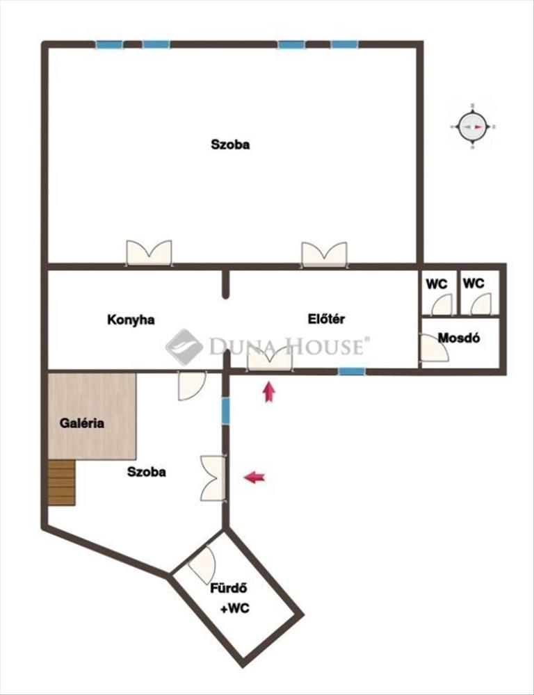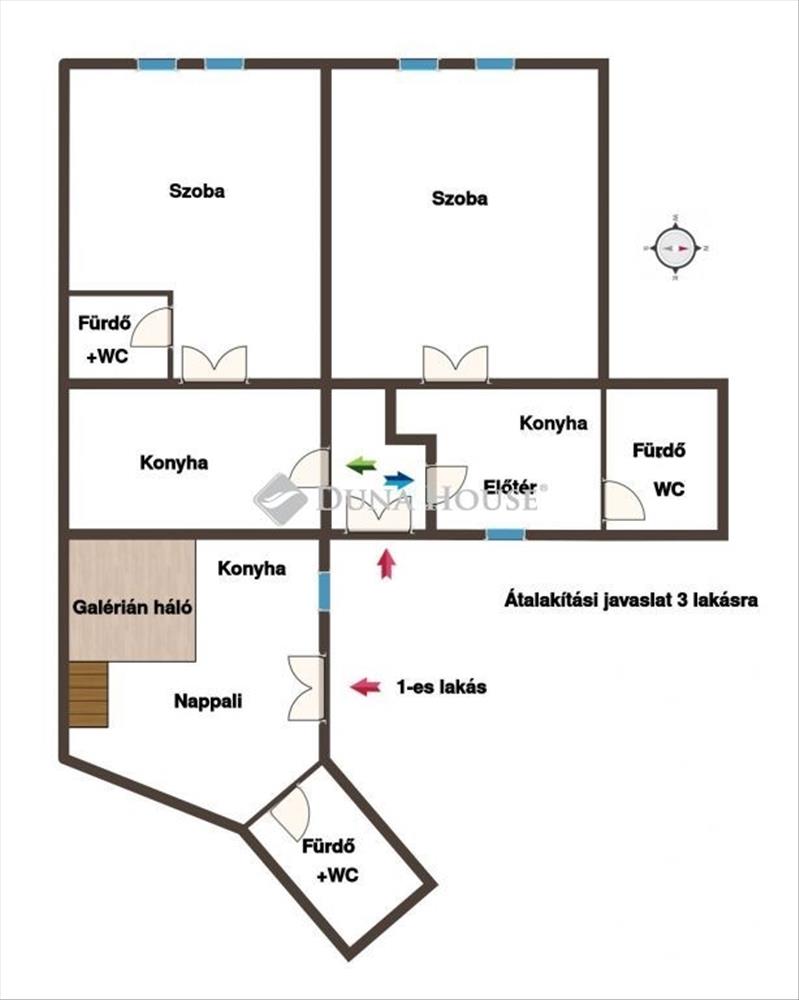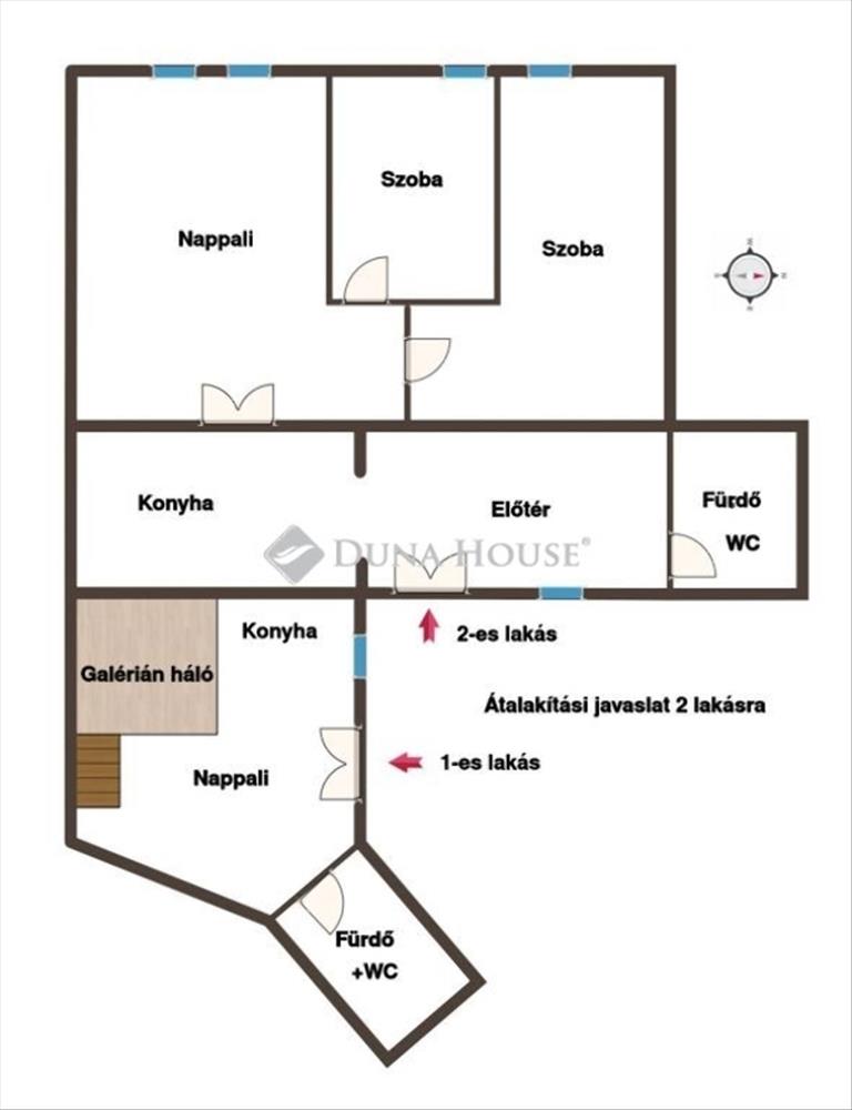 Jelenleg 2 bejárattal, és 2 db főmérős villanyórával rendelkező lakás könnyen 2, kicsit nagyobb beruházással 3 lakássá alakítható.