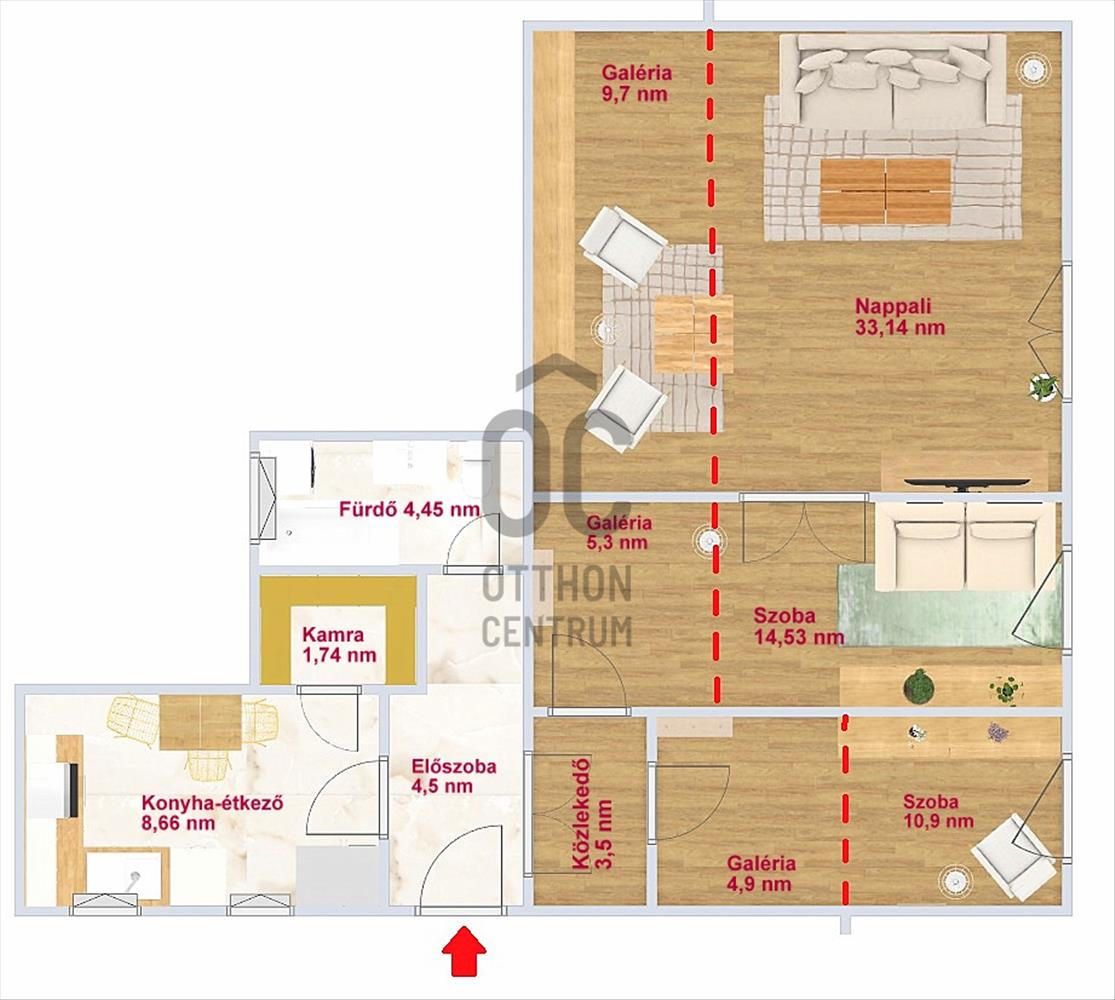 + Mind a három szoba állógalériával rendelkezik - a nappaliban fémvázas gipsszkarton burkolással, a másik kettőben fa szerkezetű.