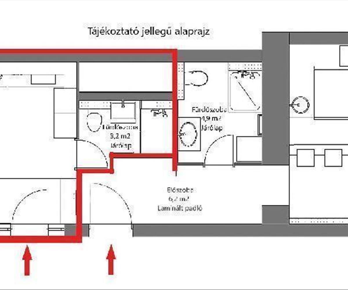 A hivatalosan 62 m2-es megosztott ingatlan bal oldali lakása. a valóságban 39 m2 hasznos alapterületű otthon, egyedi elrendezésének köszönhetően maximális kényelmet biztosít.