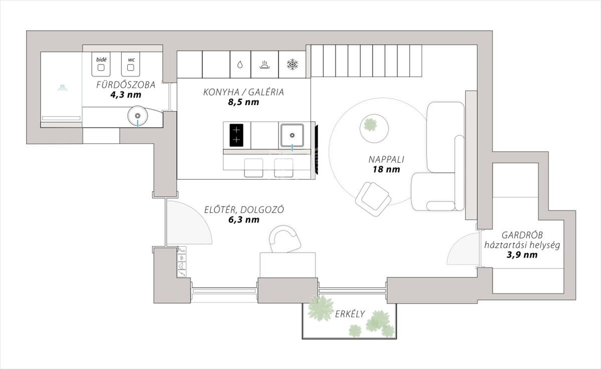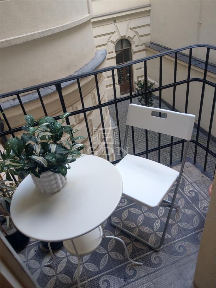 Az 1. emeleti, 41 m²-es lakás praktikus elrendezésű, amelyhez 8 m²-es galéria és egy 2 m²-es terasz is tartozik. Az ablakok és a terasz a gondosan megújított belső udvarra néznek, így a belvárosi elhelyezkedés ellenére csendes, nyugodt életteret biztosítanak.