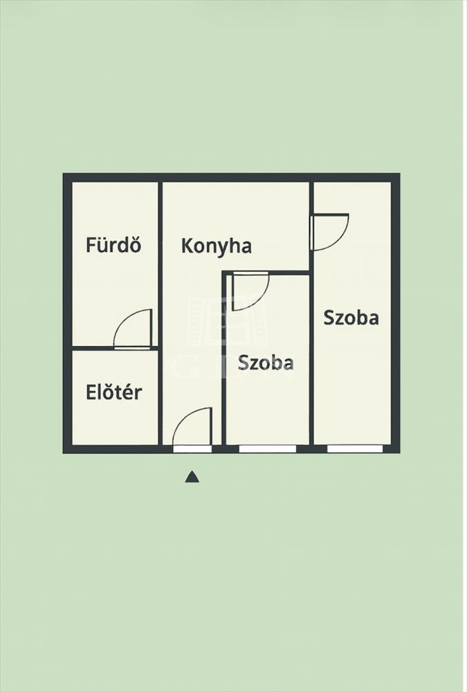 előszoba, hall, melyből két szoba nyílik, étkező, konyha, fürdőszoba