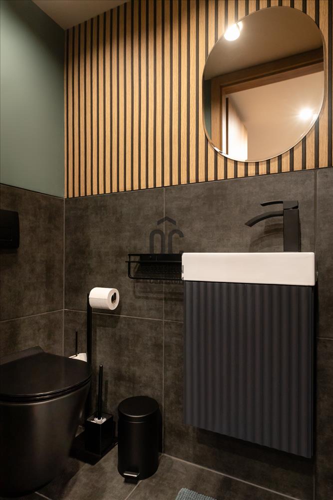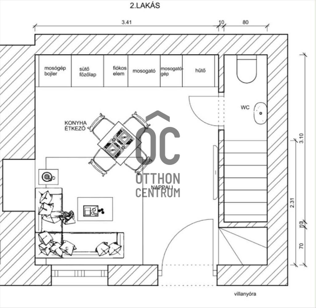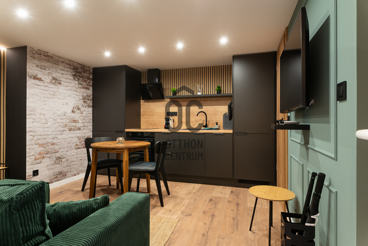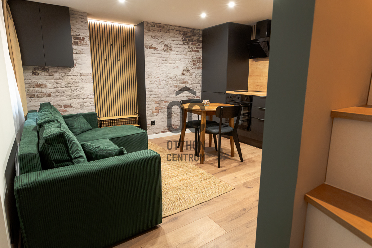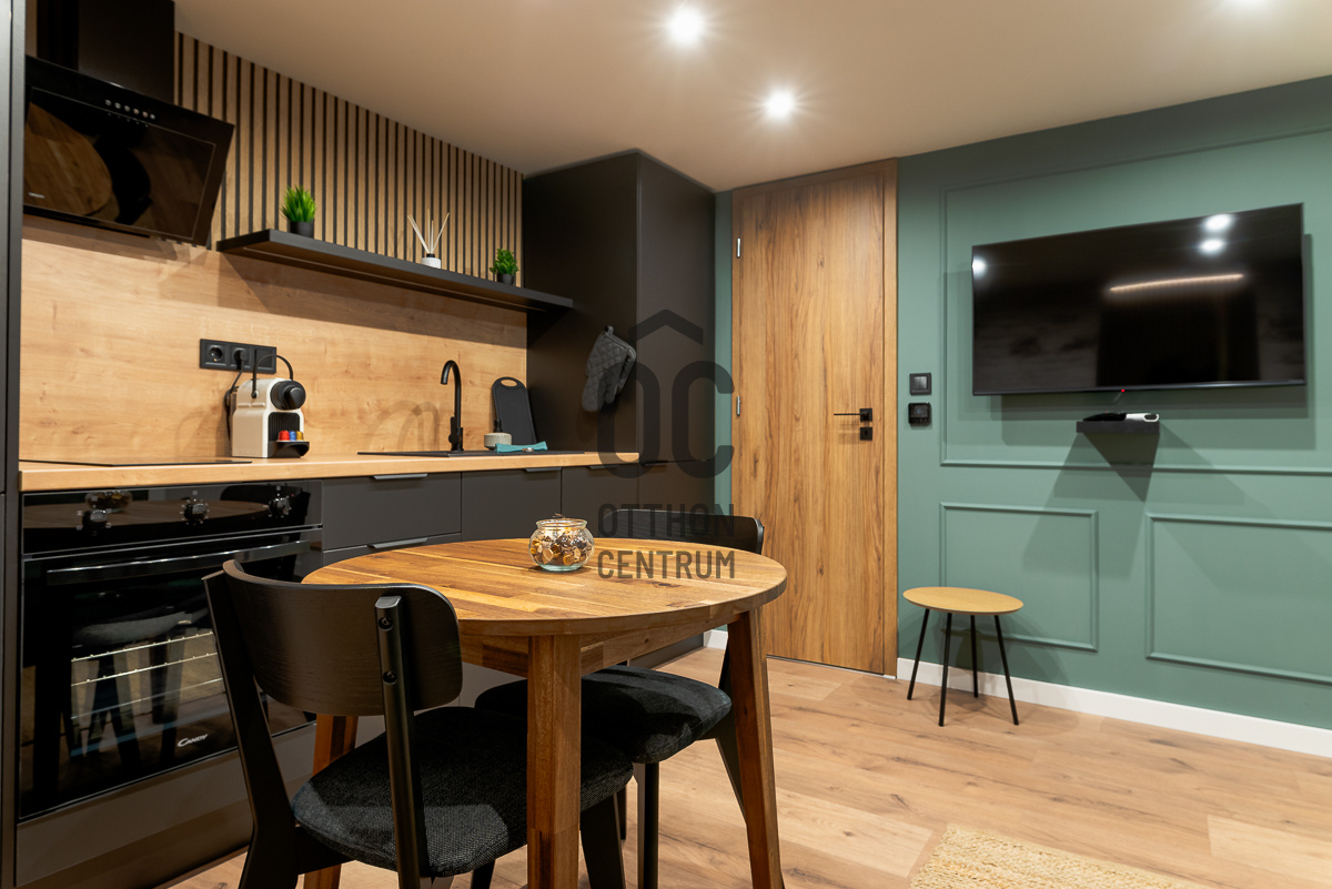 Az alsó szinten amerikai konyhás nappali–étkező kapott helyet, modern, gépesített konyhával, míg a felső szinten egy külön hálószoba és fürdőszoba található. a lakás külön WC-vel is rendelkezik, ami ritka és kifejezetten praktikus megoldás ebben a méretkategóriában.