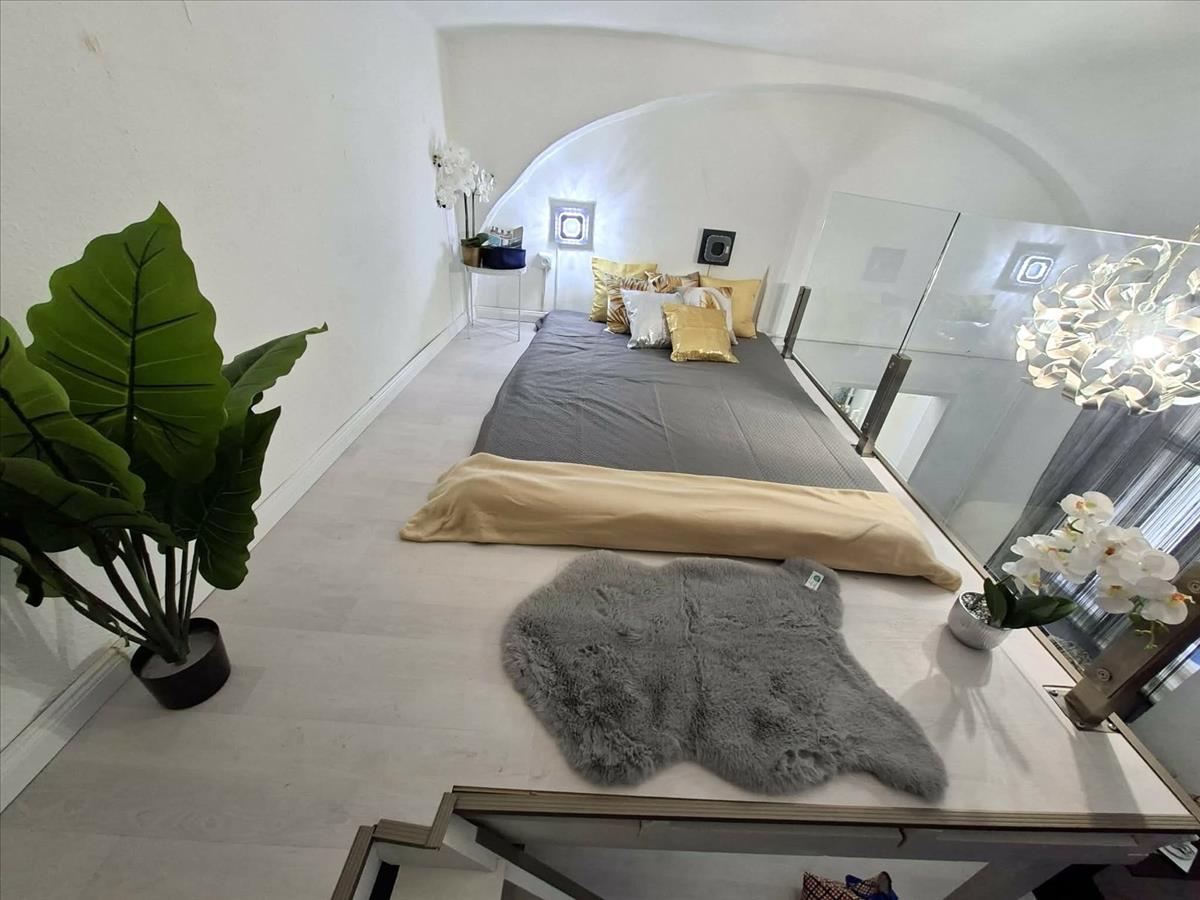 Nagy belmagasság, 8 m2 galéria, ahol elfér egy kétszemélyes ágy, és egy éjjeliszekrény.