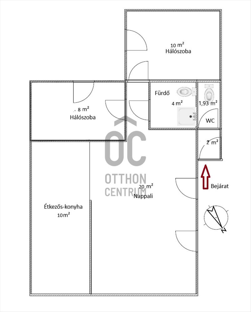 Egy használható méretű előszobába érkezünk. Inne nyíilik a vendég wc is. Továbbhaladva a nappaliba, étkezős konyhába érkezünk. a nappaliból kis folyósón keresztül jutunk el a két különnyíló hálószobába és a fürdőszobába.