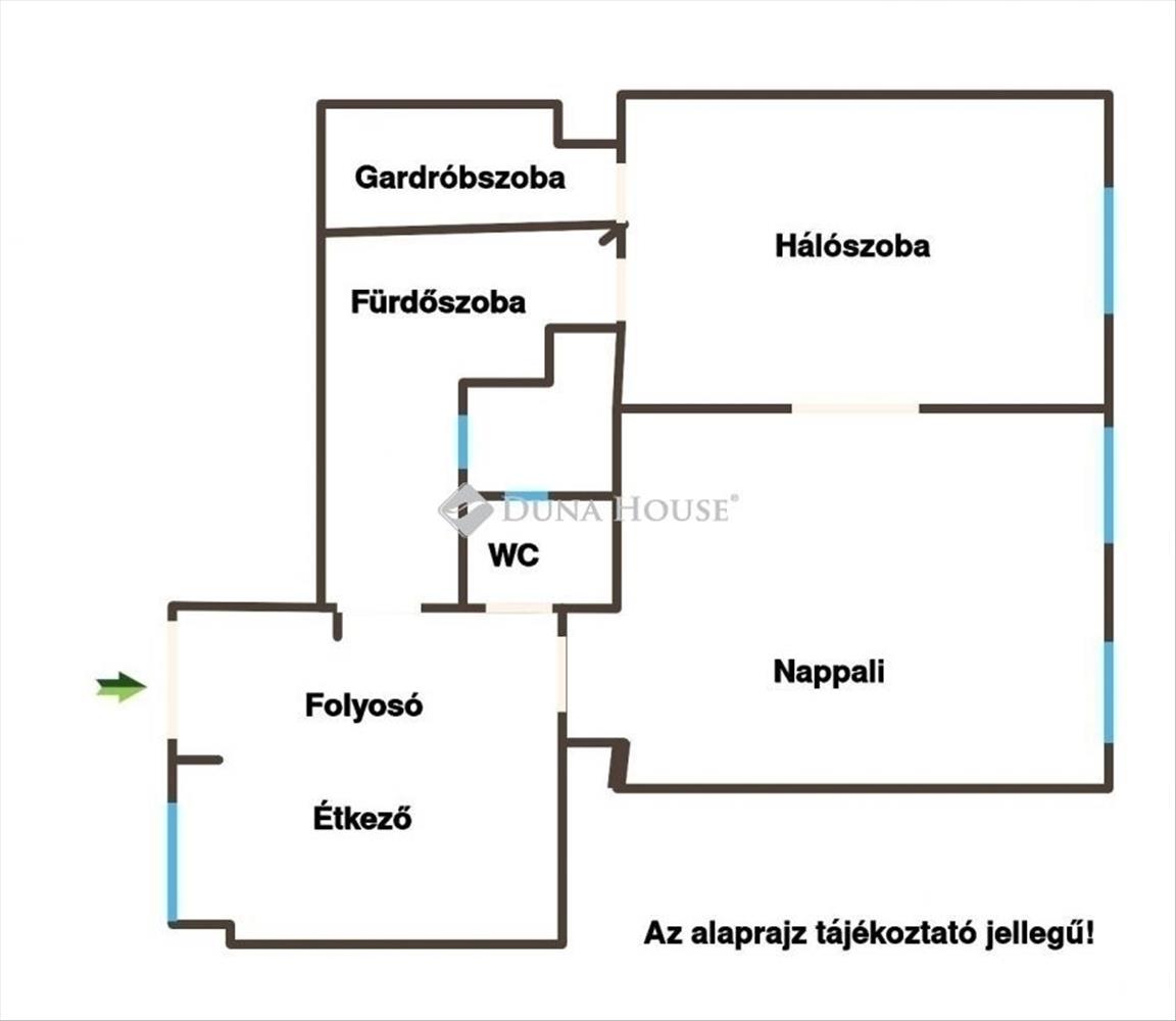 A jó állapotú társasház 1. emeletén található ingatlan, nappalival, konyhával, hálószobával, fürdőszobával, különálló WC-vel valamint gardróbszobával rendelkezik.
