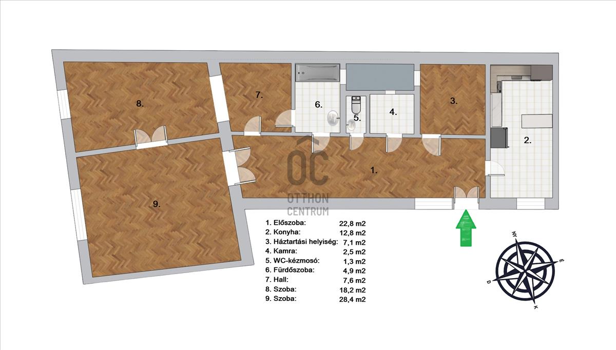 - 4. emeleti, 106 m2 alapterületű, jelenleg 2 szoba + hallos, felújítást igénylő ingatlan.