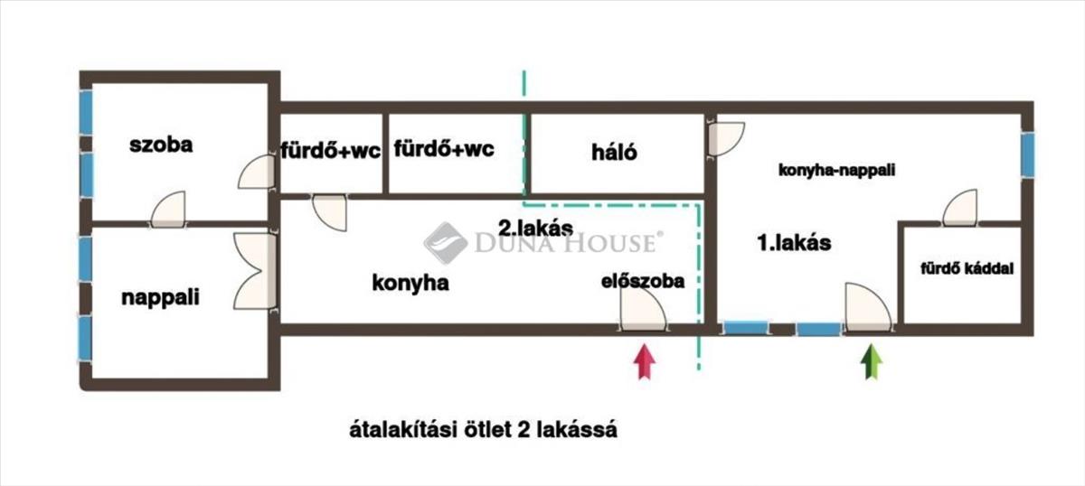 Két bejárat → akár két különálló lakás kialakítása