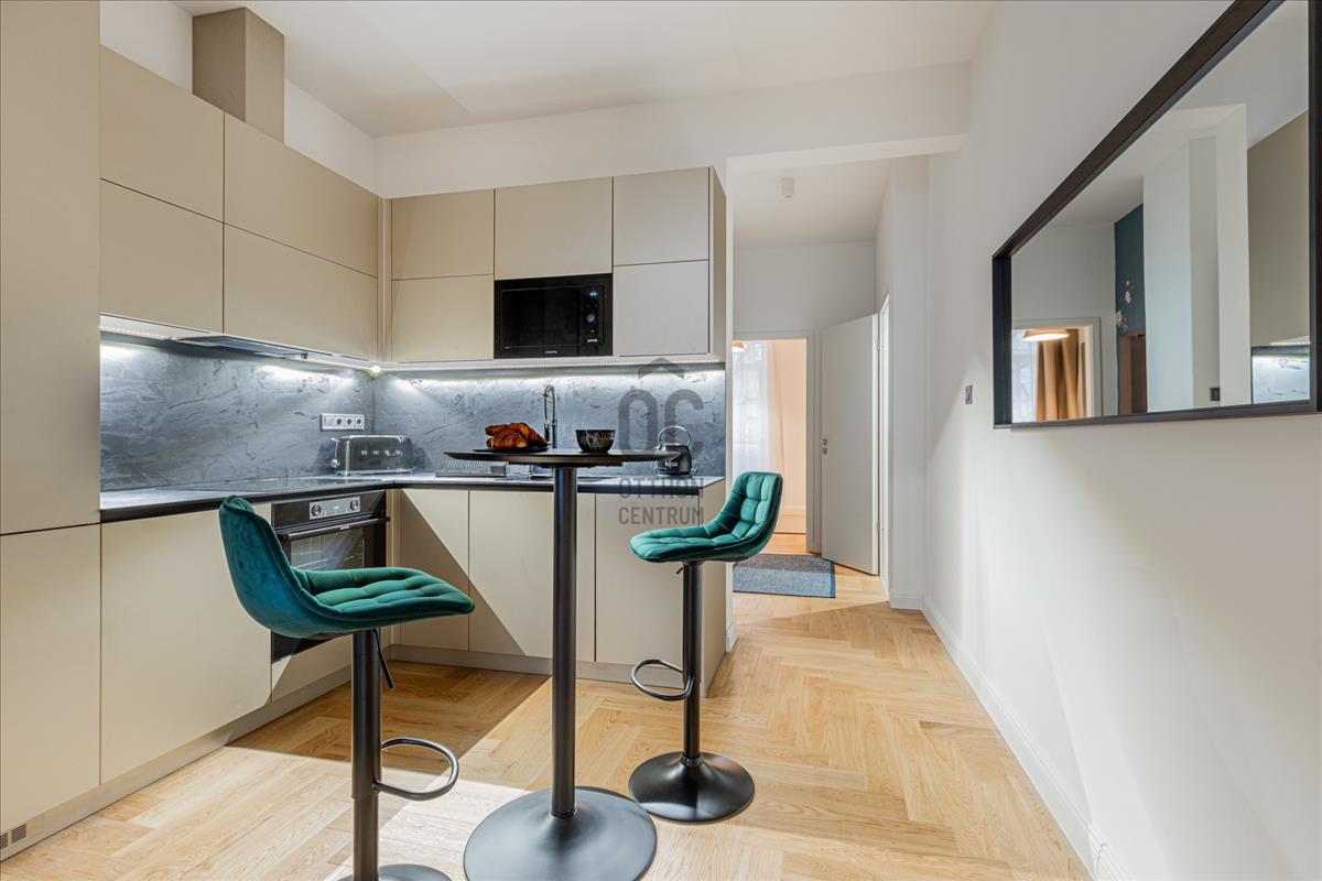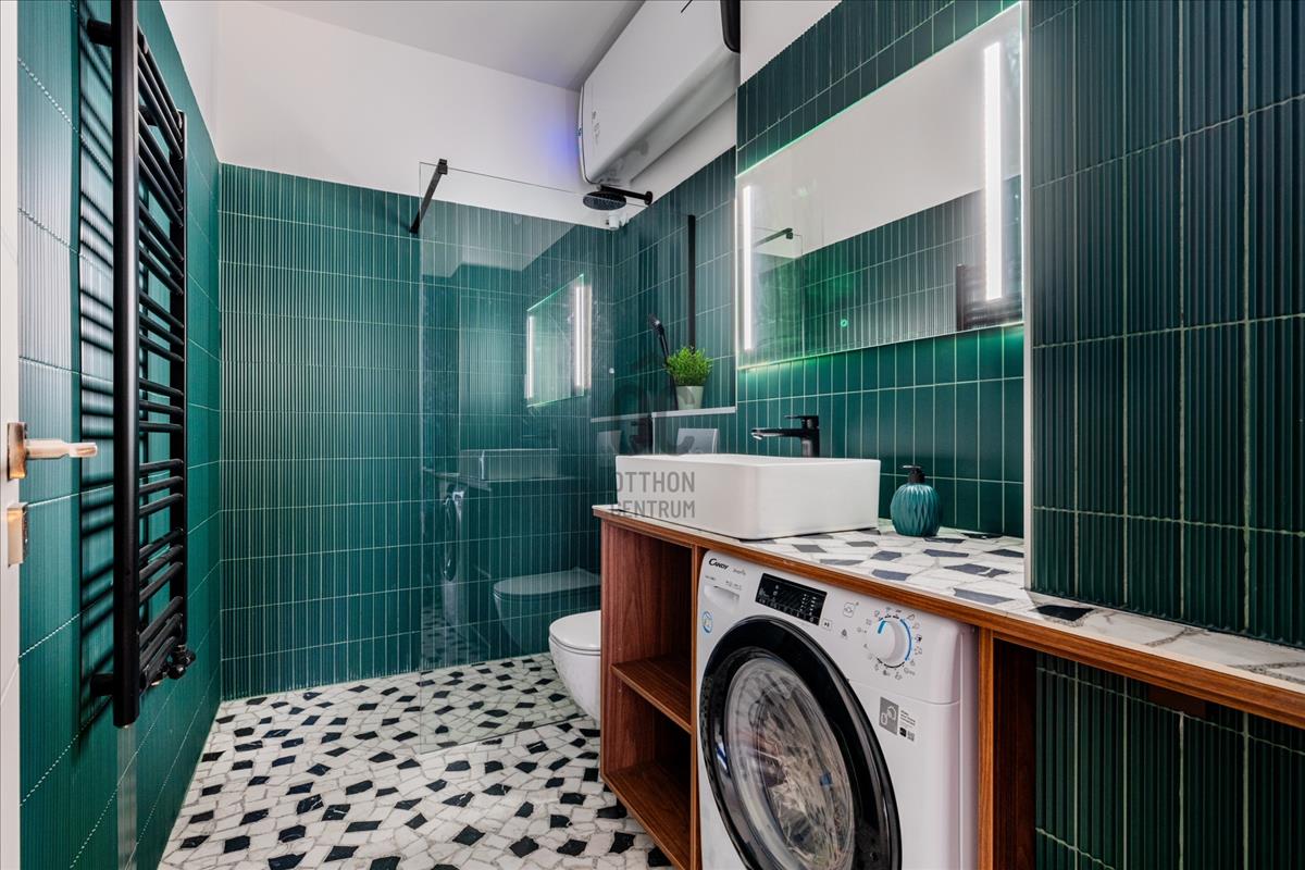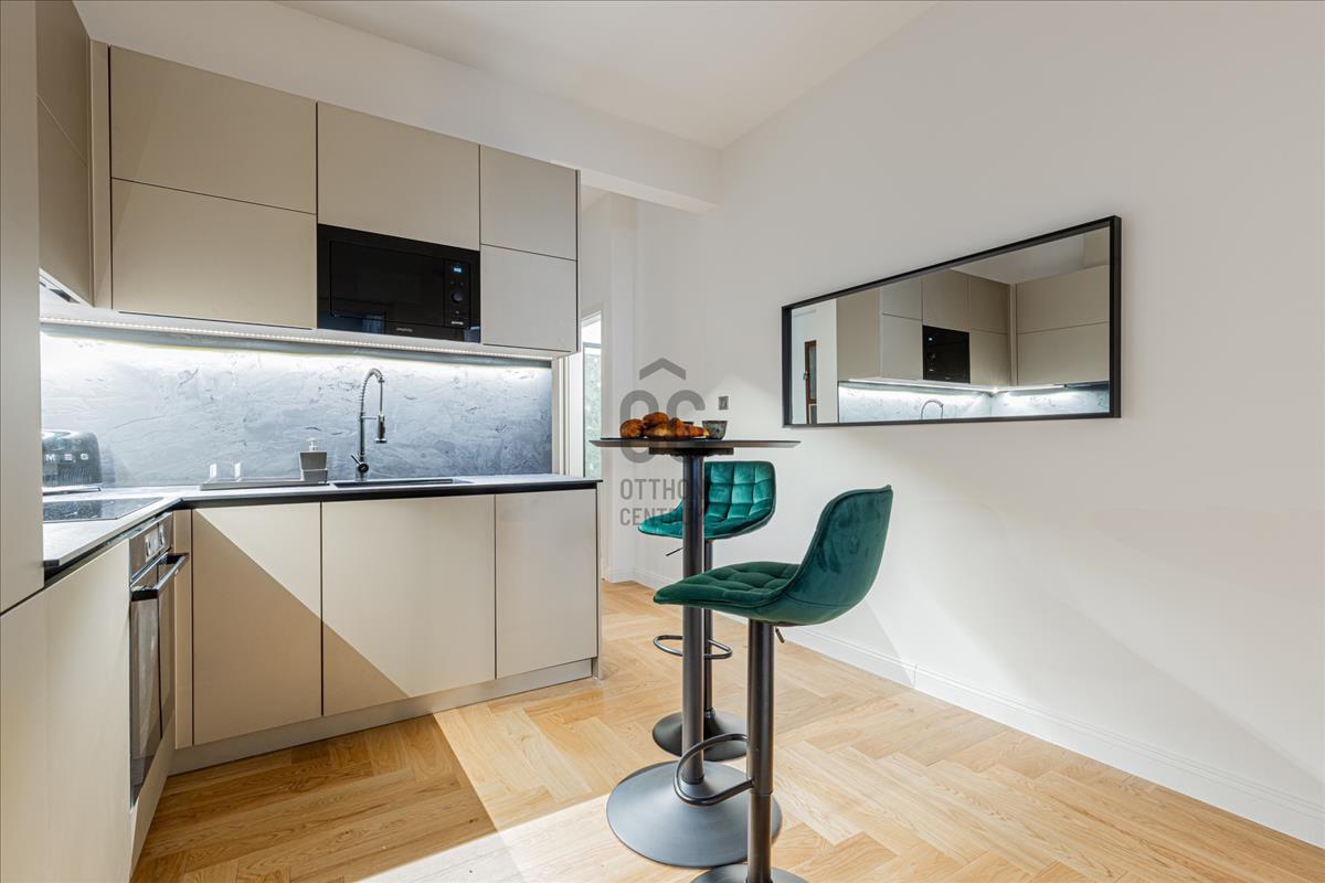 A teljes körű műszaki és esztétikai megújulás során minden részlet prémium minőségben került kivitelezésre: megújult gépészet és elektromos hálózat, új nyílászárók, elegáns halszálkás fa parketta. a külön helyiségben kialakított konyhát magas minőségű Bosch gépek emelik professzionális szintre.