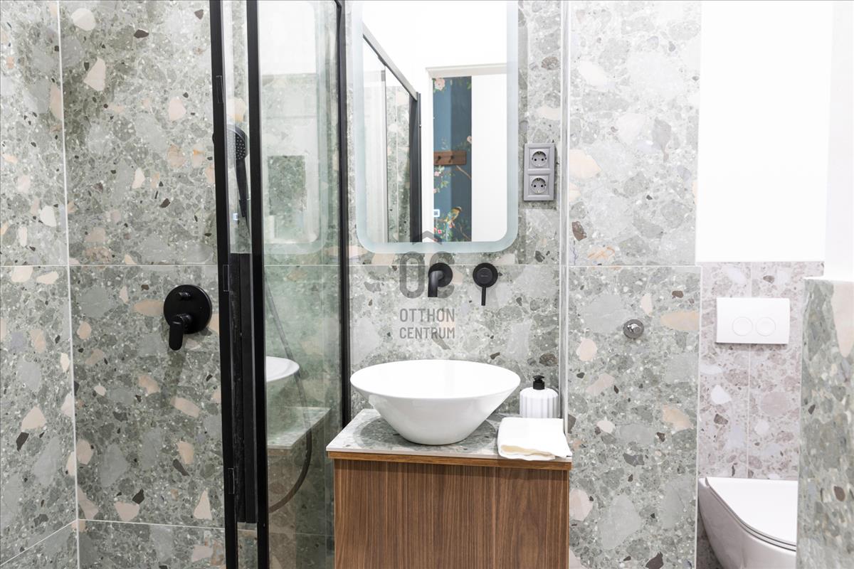 A nappali és a franciaerkélyes fő hálószoba a ház előtt kiszélesedő, hangulatos utcára néz, míg a második hálószoba saját erkéllyel és külön fürdőszobával a csendes, fás belső udvar felé tájolt — ritka kettősséget teremtve a belvárosi pezsgés és az intim nyugalom között.