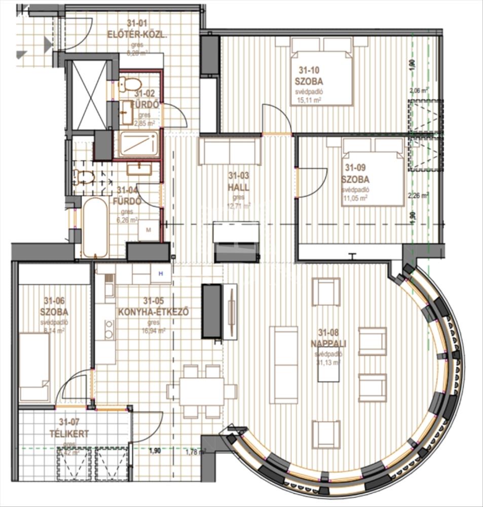 Az enteriőrt személyre szabottan alakítjuk ki, így otthonod megfelel az igényeidnek és kifejezi egyediségedet. Az apartman három hálószobához kétl fürdőszoba tartozik, valamint egy 2, 4m2-es loggia is. a pontos beosztás az alaprajzon látható.