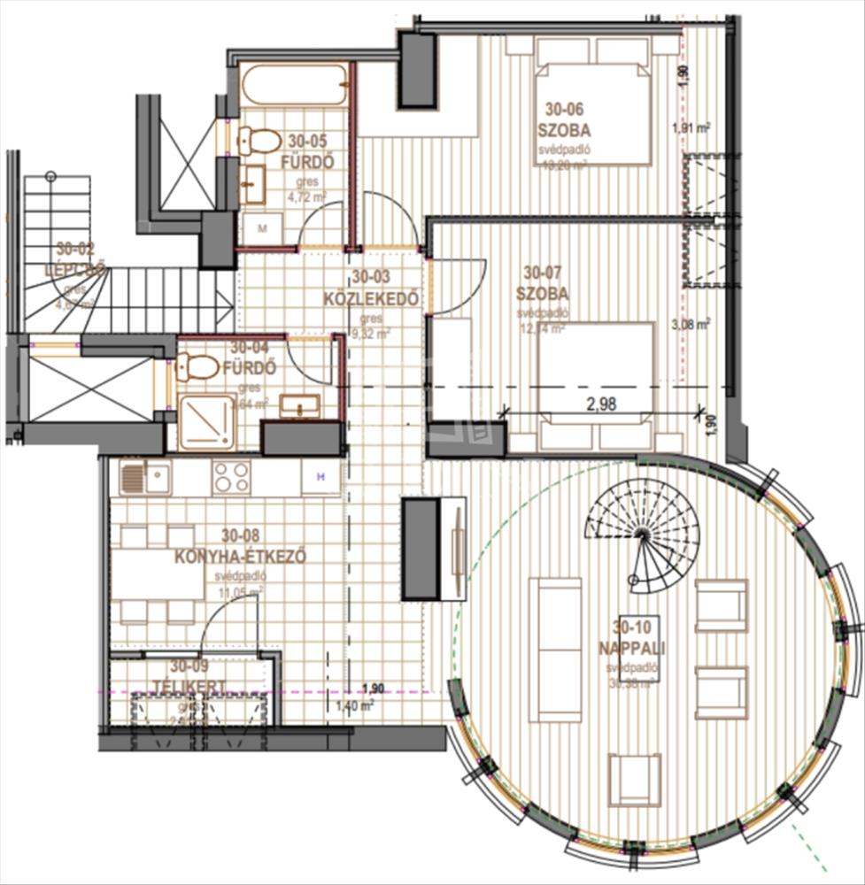 Az enteriőrt személyre szabottan alakítjuk ki, így otthonod megfelel az igényeidnek és kifejezi egyediségedet. Az apartman három hálószobához kétl fürdőszoba tartozik, valamint egy 2, 4m2-es loggia is. a pontos beosztás az alaprajzon látható.