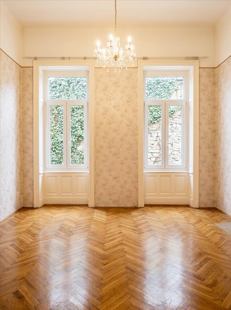Budapest szívében, a VI. kerületi Terézvárosban, az Oktogon, Andrássy út és Nyugati pályaudvar közvetlen közelében, az Eötvös utcában kínálunk megvételre egy 64 m²-es, első emeleti 2 nagy szobás nagypolgári lakást.