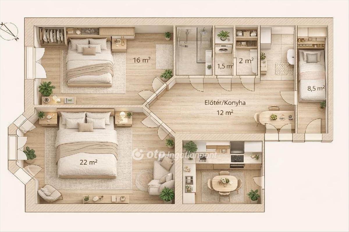 2 külön nyíló szoba + tágas nappali, konyha étkezővel, fürdőszoba külön toalettel.