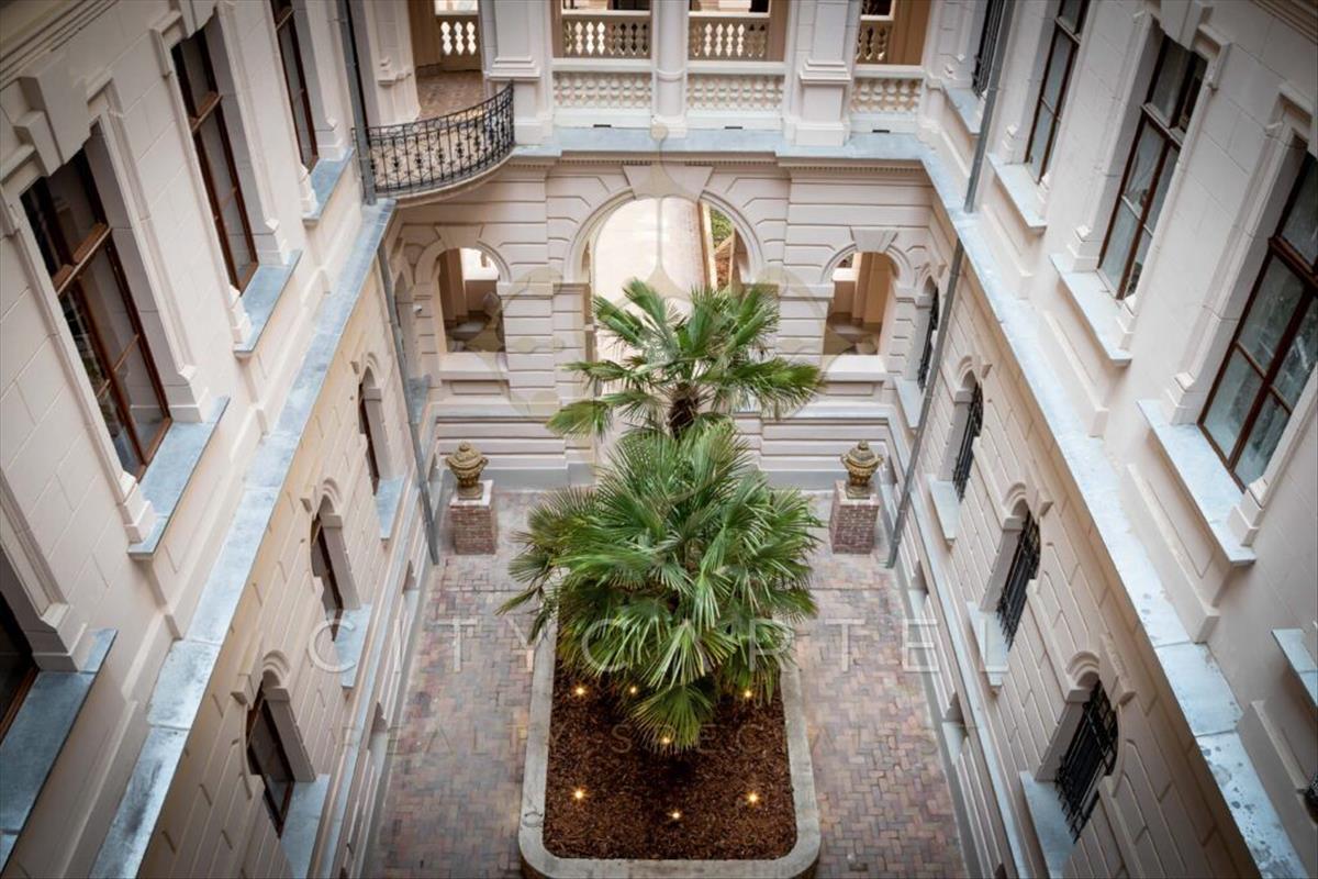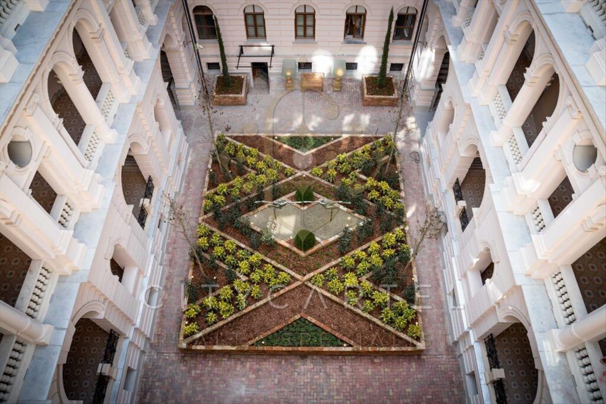 A külső díszudvar szökőkúttal és díszfákkal kialakított, az épületen belül négy különleges udvarral rendelkezik az épület: