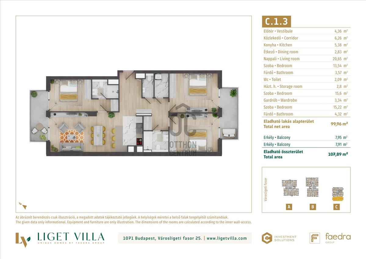 A pesti diplomatanegyed legszebb utcájában épül, a megjelenésében, műszaki tartalmában és a lakáskínálata tekintetében egyaránt unikális, Liget Villa Lakópark. Az épületbe érve, egy elegáns lobby és recepcióra érkezünk majd. Innen a három épületet egy kerti úton, passzázs köti majd össze. a tervezés során nagy hangsúlyt kapott a családi igényekre tervezett lakás minőségi használhatósága. Ablakos konyhák, master bedroom-ok, dupla fürdőszobák, gardrób és háztartási helyiségek is helyet kapnak a lakásban. Kiemelten jól bútorzható, két irányba tájolt lakások kerülnek kialakításra. a földszinti lakásokhoz 50-100 m2-es privát kertek, míg a közös területeken tájépítész által tervezett reprezentatív kertet alakítunk ki. a lakásokban mennyezeti hűtés-fűtés biztosítja a téli-nyári kellemes komfortérzetet. a nyílászárók 3 rétegű üveggel, alu-fa kivitelben kerülnek beépítésre. a lakások ára tartalmazza alapárban az alu elektromos redőnyöket és okosotthon kiépítést is. Magas minőségű olasz és spanyol hidegburkolatválasztékban akár 60x60 cm-es lapok is válaszhatóak majd. a fa parketta és az átlag feletti minőség szaniterek, szintén alapárban válaszhatóak a lakásokba. Az épületek alatti mélygarázsban gépkocsibeállók és tárolók kerülnek kialakításra.