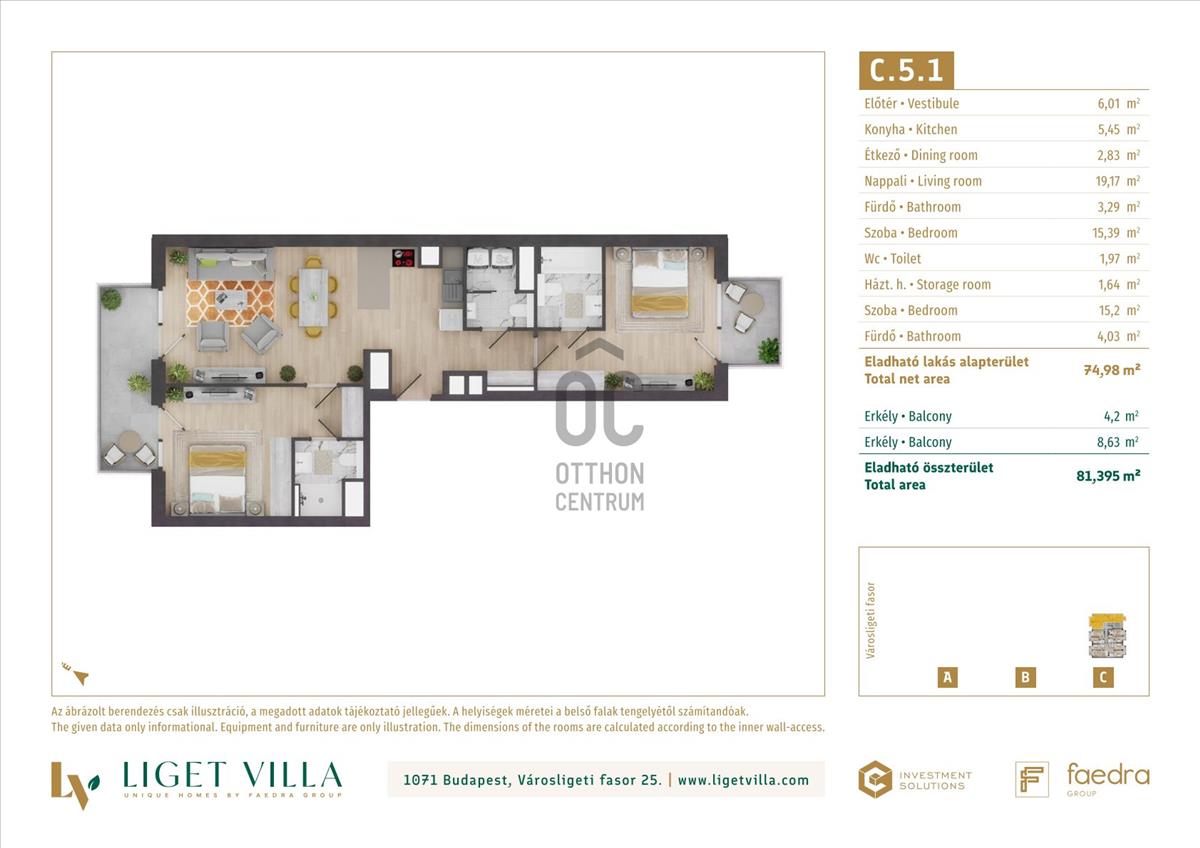 A pesti diplomatanegyed legszebb utcájában épül, a megjelenésében, műszaki tartalmában és a lakáskínálata tekintetében egyaránt unikális, Liget Villa Lakópark. Az épületbe érve, egy elegáns lobby és recepcióra érkezünk majd. Innen a három épületet egy kerti úton, passzázs köti majd össze. a tervezés során nagy hangsúlyt kapott a családi igényekre tervezett lakás minőségi használhatósága. Ablakos konyhák, master bedroom-ok, dupla fürdőszobák, gardrób és háztartási helyiségek is helyet kapnak a lakásban. Kiemelten jól bútorzható, két irányba tájolt lakások kerülnek kialakításra. a földszinti lakásokhoz 50-100 m2-es privát kertek, míg a közös területeken tájépítész által tervezett reprezentatív kertet alakítunk ki. a lakásokban mennyezeti hűtés-fűtés biztosítja a téli-nyári kellemes komfortérzetet. a nyílászárók 3 rétegű üveggel, alu-fa kivitelben kerülnek beépítésre. a lakások ára tartalmazza alapárban az alu elektromos redőnyöket és okosotthon kiépítést is. Magas minőségű olasz és spanyol hidegburkolatválasztékban akár 60x60 cm-es lapok is válaszhatóak majd. a fa parketta és az átlag feletti minőség szaniterek, szintén alapárban válaszhatóak a lakásokba. Az épületek alatti mélygarázsban gépkocsibeállók és tárolók kerülnek kialakításra.