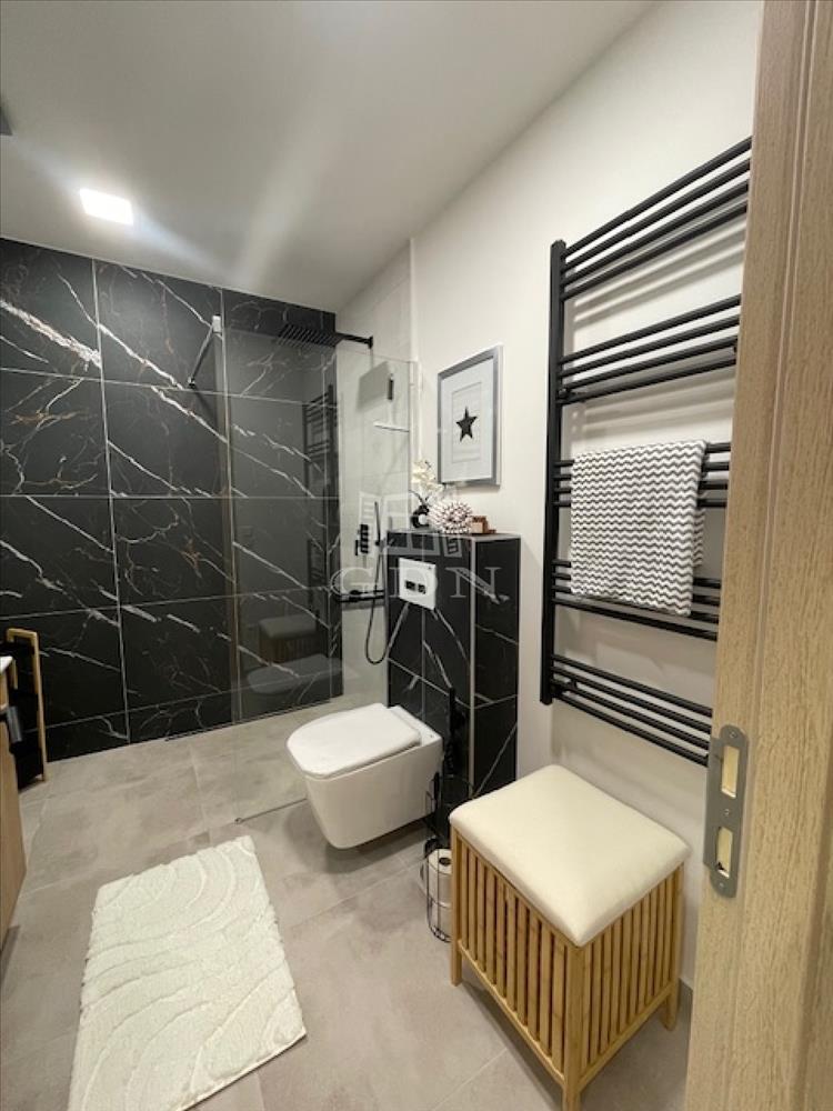 A két szobás lakást igényesen újították fel, modern és praktikus berendezéssel.
