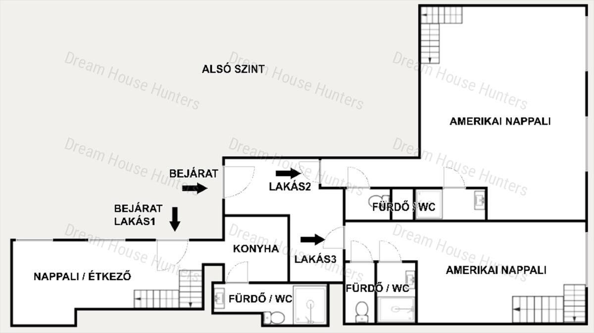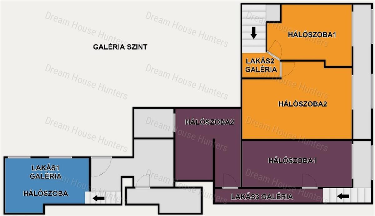 3 Külön bejáratú lakás került kialakításra összesen 5 db hálószobával, mindegyik zárt szelvényes kialakítású, 2 méteres belmagasságú galériával. Az alsó szinteken mindegyik lakóegység teljes értékű konyhával, nappalival és zuhanyzós fürdőszobával rendelkezik.