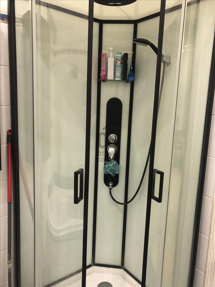 A fürdőszoba felújítása során a kád mellé egy zuhanykabin is beépítésre került.