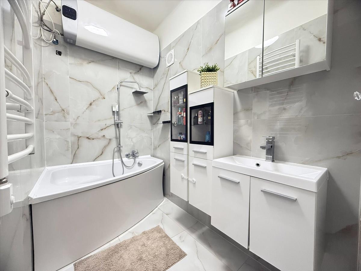 Modern, esztétikusan kialakított fürdőszoba és ízlésesen berendezett, részben bútorozott belső tér.