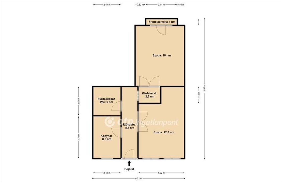 Két tágas, különnyíló szobája kényelmes életteret ad, az étkezős konyha a mindennapok természetes központja. a fürdőszoba és a wc egy helyiségben található.