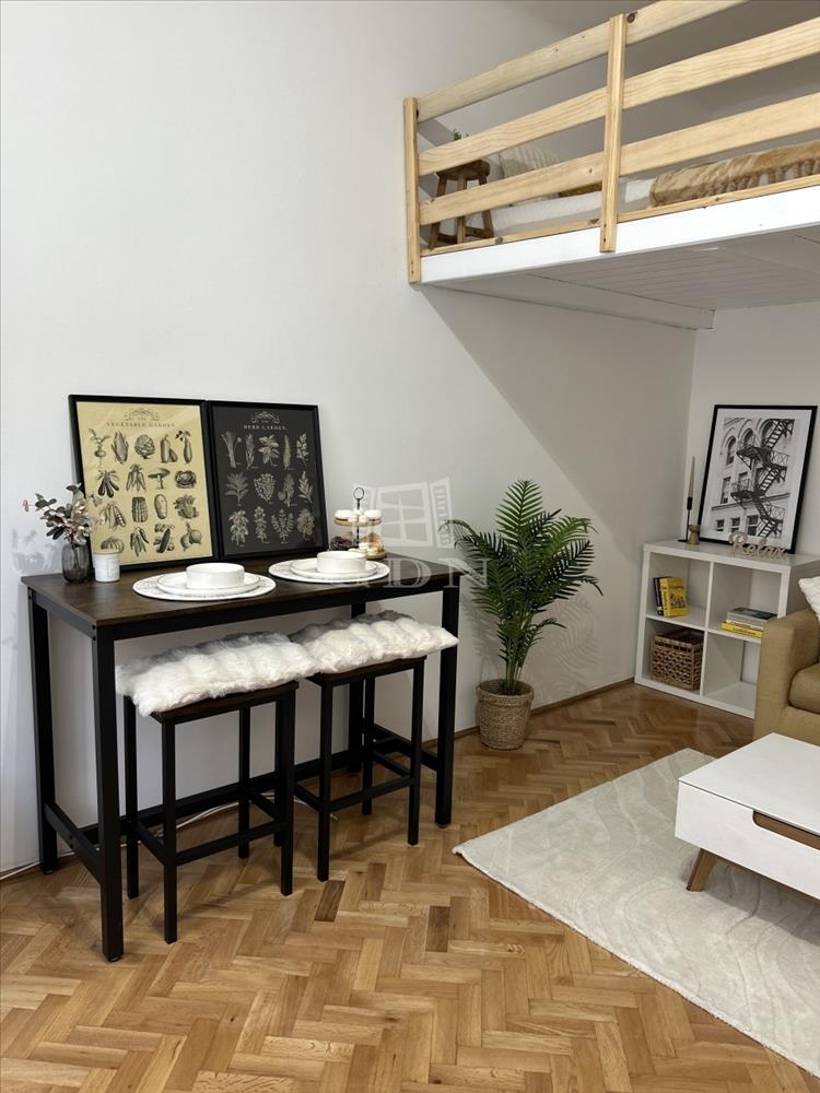 A nappaliban már valódi otthonhangulat vár. a nagy belmagasság és a szépen felújított tömörfa galéria meglepően nagy teret teremt egy 25 m²-es lakásban: lent a nappali világos és tágas, fent a galéria pedig búvóhely jellegű, nyugodt hálórészként működik. Esténként a lágy fények, télen pedig a hűtő-fűtő klíma kellemes melege teszi igazán otthonossá.