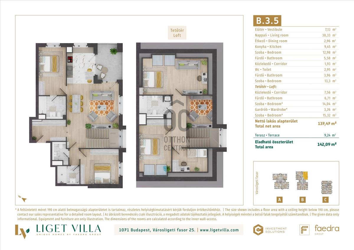 A pesti diplomatanegyed legszebb utcájában épül, a megjelenésében, műszaki tartalmában és a lakáskínálata tekintetében egyaránt unikális, Liget Villa Lakópark. Az épületbe érve, egy elegáns lobby és recepcióra érkezünk majd. Innen a három épületet egy kerti úton, passzázs köti majd össze. a tervezés során nagy hangsúlyt kapott a családi igényekre tervezett lakás minőségi használhatósága. Ablakos konyhák, master bedroom-ok, dupla fürdőszobák, gardrób és háztartási helyiségek is helyet kapnak a lakásban. Kiemelten jól bútorzható, két irányba tájolt lakások kerülnek kialakításra. a földszinti lakásokhoz 50-100 m2-es privát kertek, míg a közös területeken tájépítész által tervezett reprezentatív kertet alakítunk ki. a lakásokban mennyezeti hűtés-fűtés biztosítja a téli-nyári kellemes komfortérzetet. a nyílászárók 3 rétegű üveggel, alu-fa kivitelben kerülnek beépítésre. a lakások ára tartalmazza alapárban az alu elektromos redőnyöket és okosotthon kiépítést is. Magas minőségű olasz és spanyol hidegburkolatválasztékban akár 60x60 cm-es lapok is válaszhatóak majd. a fa parketta és az átlag feletti minőség szaniterek, szintén alapárban válaszhatóak a lakásokba. Az épületek alatti mélygarázsban gépkocsibeállók és tárolók kerülnek kialakításra.