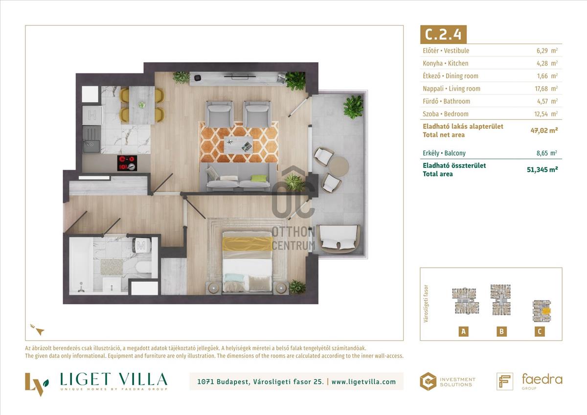 A pesti diplomatanegyed legszebb utcájában épül, a megjelenésében, műszaki tartalmában és a lakáskínálata tekintetében egyaránt unikális, Liget Villa Lakópark. Az épületbe érve, egy elegáns lobby és recepcióra érkezünk majd. Innen a három épületet egy kerti úton, passzázs köti majd össze. a tervezés során nagy hangsúlyt kapott a családi igényekre tervezett lakás minőségi használhatósága. Ablakos konyhák, master bedroom-ok, dupla fürdőszobák, gardrób és háztartási helyiségek is helyet kapnak a lakásban. Kiemelten jól bútorzható, két irányba tájolt lakások kerülnek kialakításra. a földszinti lakásokhoz 50-100 m2-es privát kertek, míg a közös területeken tájépítész által tervezett reprezentatív kertet alakítunk ki. a lakásokban mennyezeti hűtés-fűtés biztosítja a téli-nyári kellemes komfortérzetet. a nyílászárók 3 rétegű üveggel, alu-fa kivitelben kerülnek beépítésre. a lakások ára tartalmazza alapárban az alu elektromos redőnyöket és okosotthon kiépítést is. Magas minőségű olasz és spanyol hidegburkolatválasztékban akár 60x60 cm-es lapok is válaszhatóak majd. a fa parketta és az átlag feletti minőség szaniterek, szintén alapárban válaszhatóak a lakásokba. Az épületek alatti mélygarázsban gépkocsibeállók és tárolók kerülnek kialakításra.