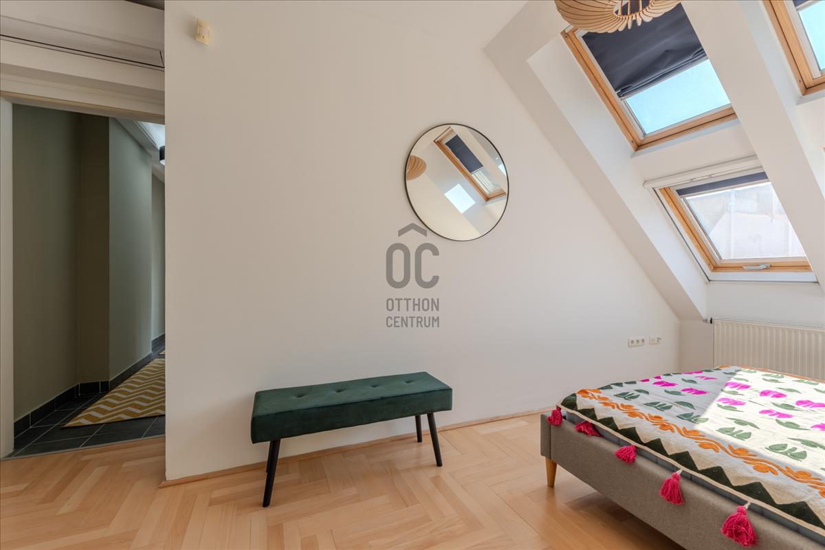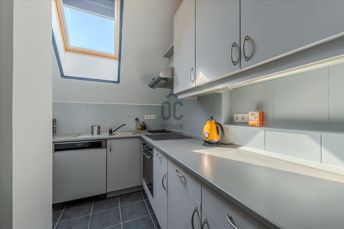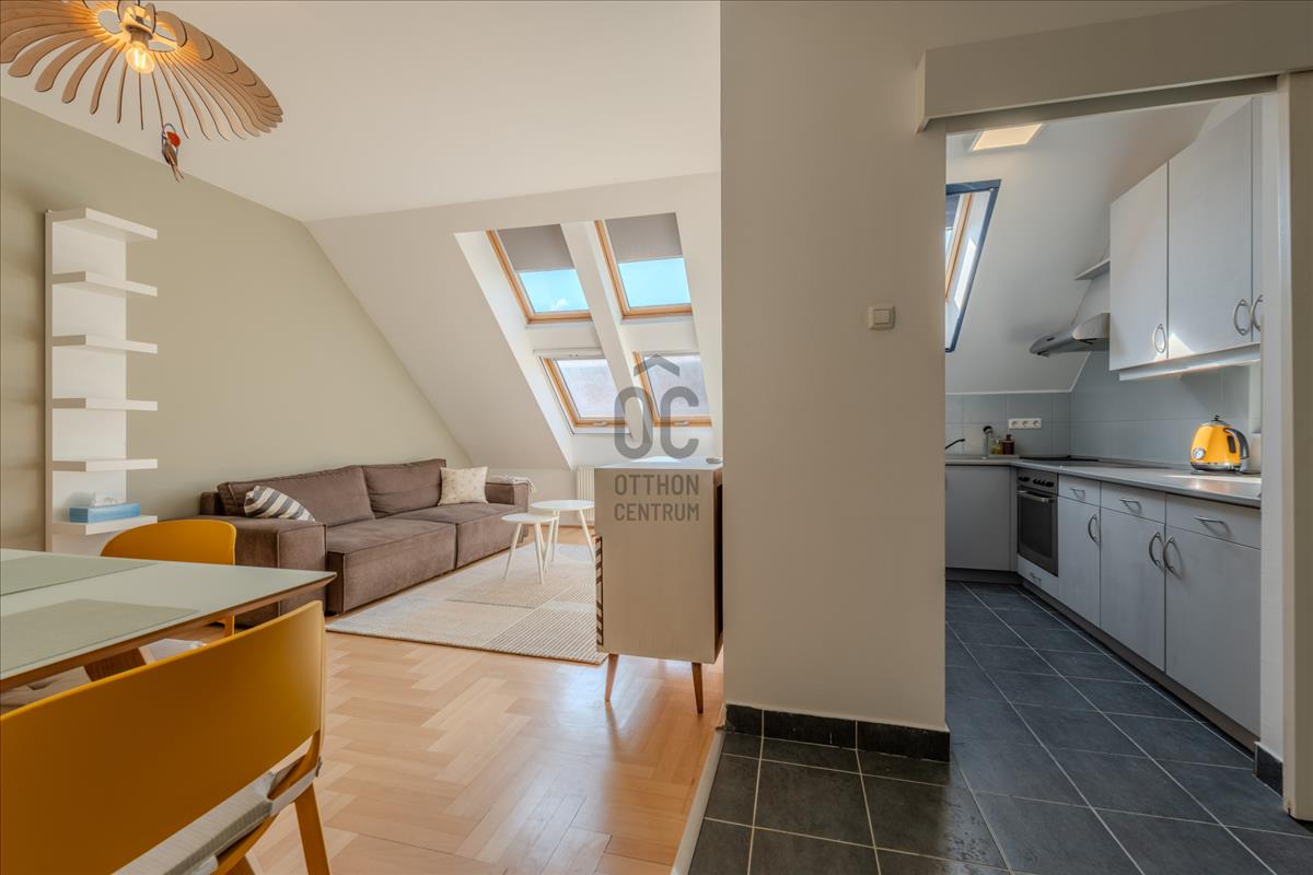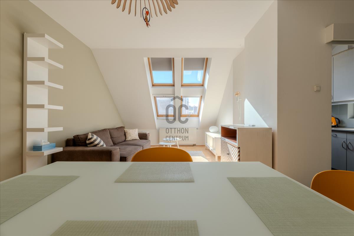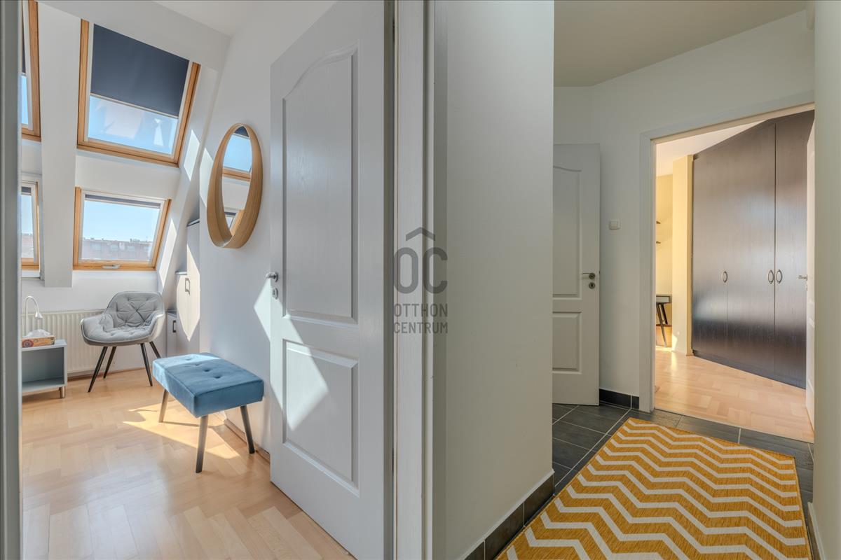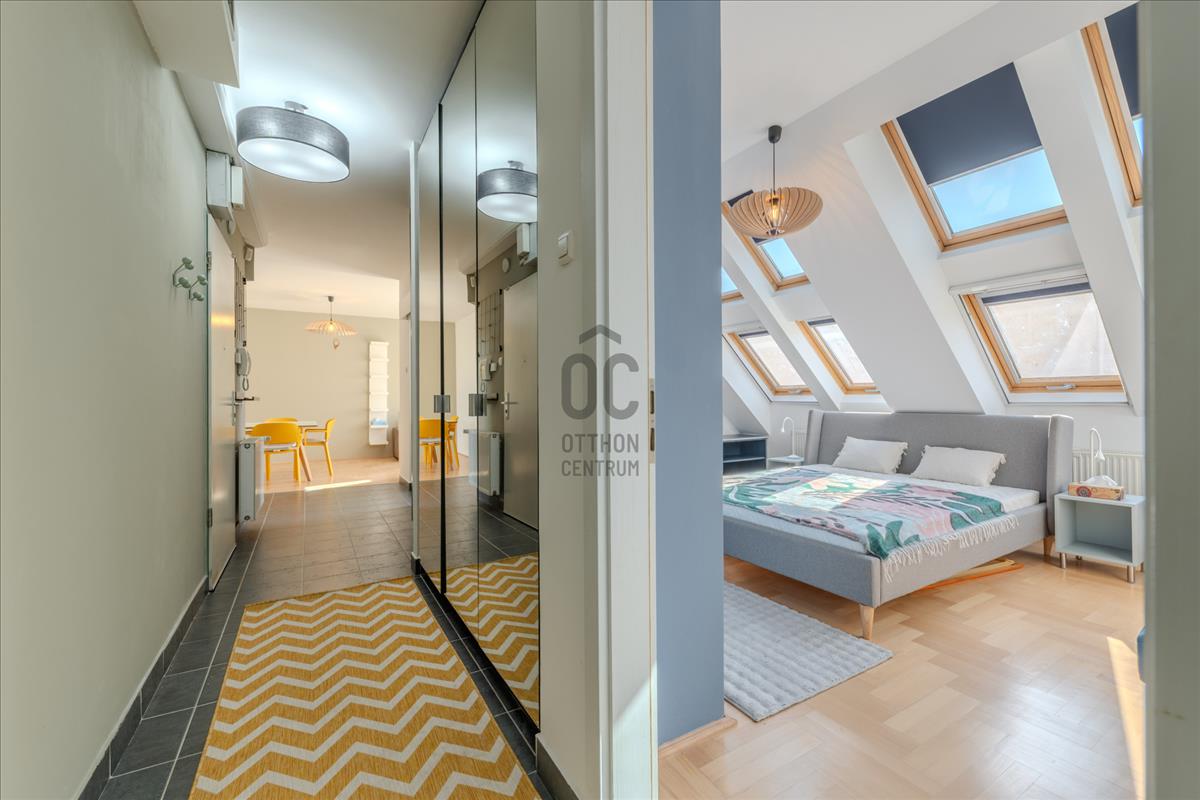 A lakás a társasház 5. emeletén (tetőtér) található, így a város felett, mégis a sűrűjében élhetsz.